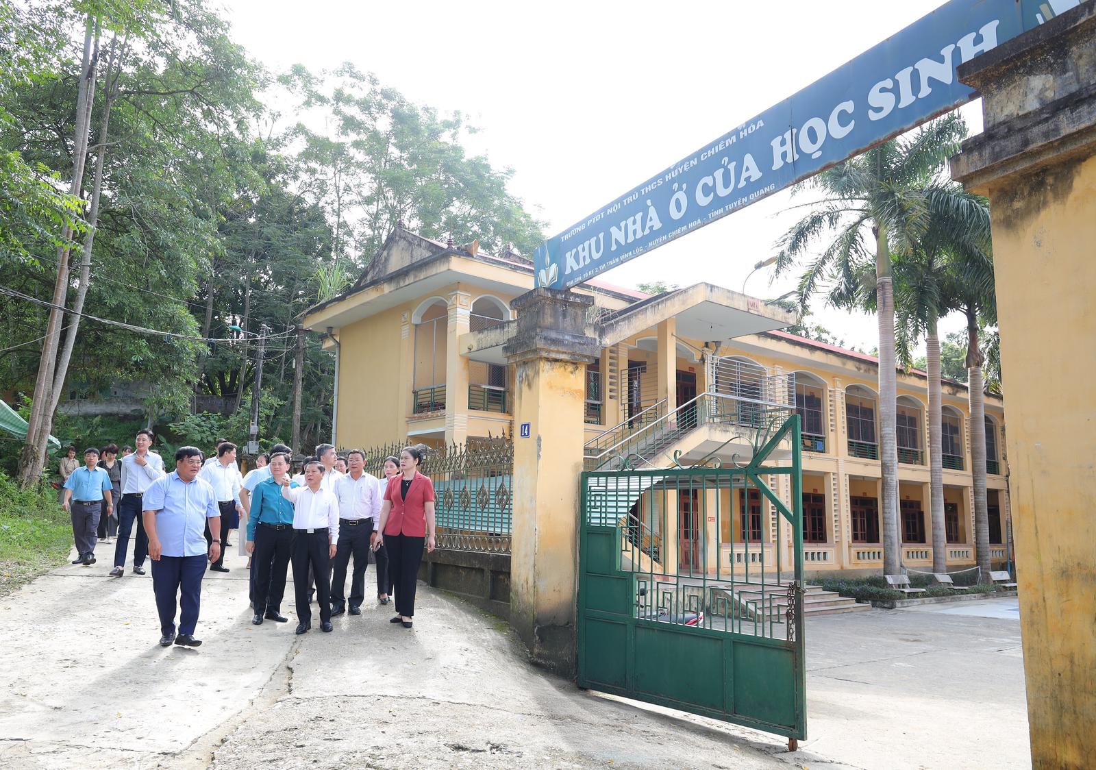Tại đây, đoàn công tác của Bộ GDĐT đã trao tặng Trường Phổ thông Dân tộc Nội trú THCS & THPT Chiêm Hóa một tivi 65 inch và bộ âm thanh phục vụ công tác giảng dạy; Nhà xuất bản Giáo dục Việt Nam hỗ trợ 20 triệu đồng nhằm giúp nhà trường sớm ổn định hoạt động dạy và học.