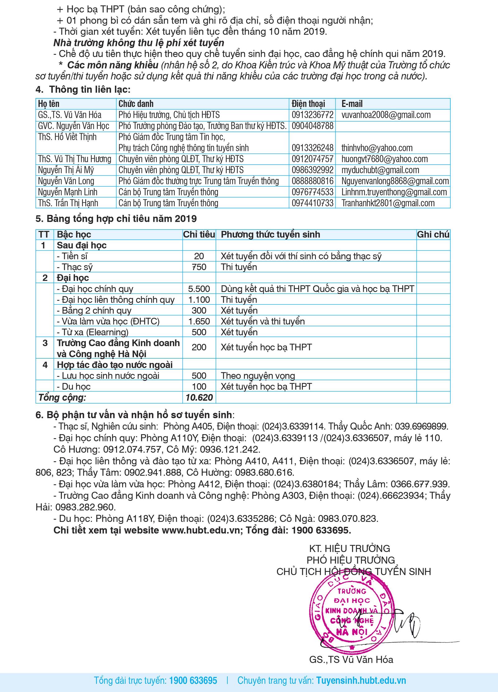 Website: www.hubt.edu.vn. Điện thoại liên hệ: (04) 3.6339113 ; (04)3.6336507 máy lẻ 110.
