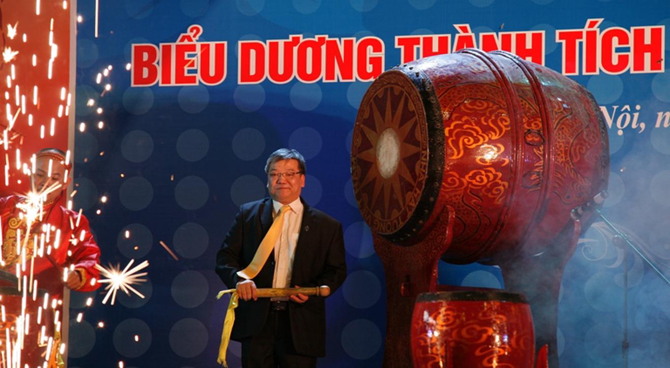 TS Trương Tiến Tùng, Viện trưởng Viện Đại học Mở Hà Nội đánh hồi trống khai giảng năm học mới. Ảnh: HH