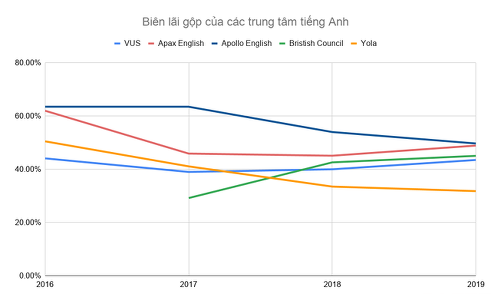Biên lãi gộp của các doanh nghiệp đều sụt giảm theo từng năm, điều này có thể phản ánh phần nào tính cạnh tranh trên thị trường giáo dục tiếng Anh ngày một gia tăng.