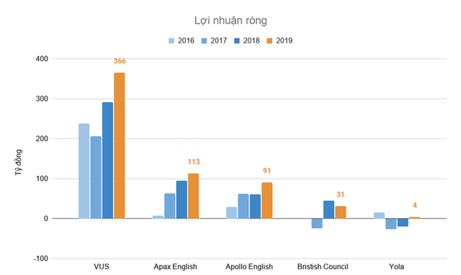 Thứ hạng về lợi nhuận ròng không có nhiều thay đổi, VUS báo lãi 366 tỷ đồng trong năm 2019, gấp hơn 3 lần Apax English thu về 113 tỷ đồng. Kế đến Apollo English lãi 91 tỷ đồng và British Council lãi 31 tỷ đồng. Yola trong năm này lãi vỏn vẹn 4 tỷ đồng, nhưng là bước tiến đáng kể sau hai năm 2017 – 2018 lỗ trên 20 tỷ đồng.