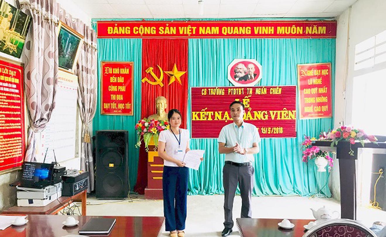 Bí thư Chi bộ, Hiệu trưởng nhà trường, thầy giáo Mỵ Văn Dục, trao Quyết định kết nạp đảng. Ảnh: MVD