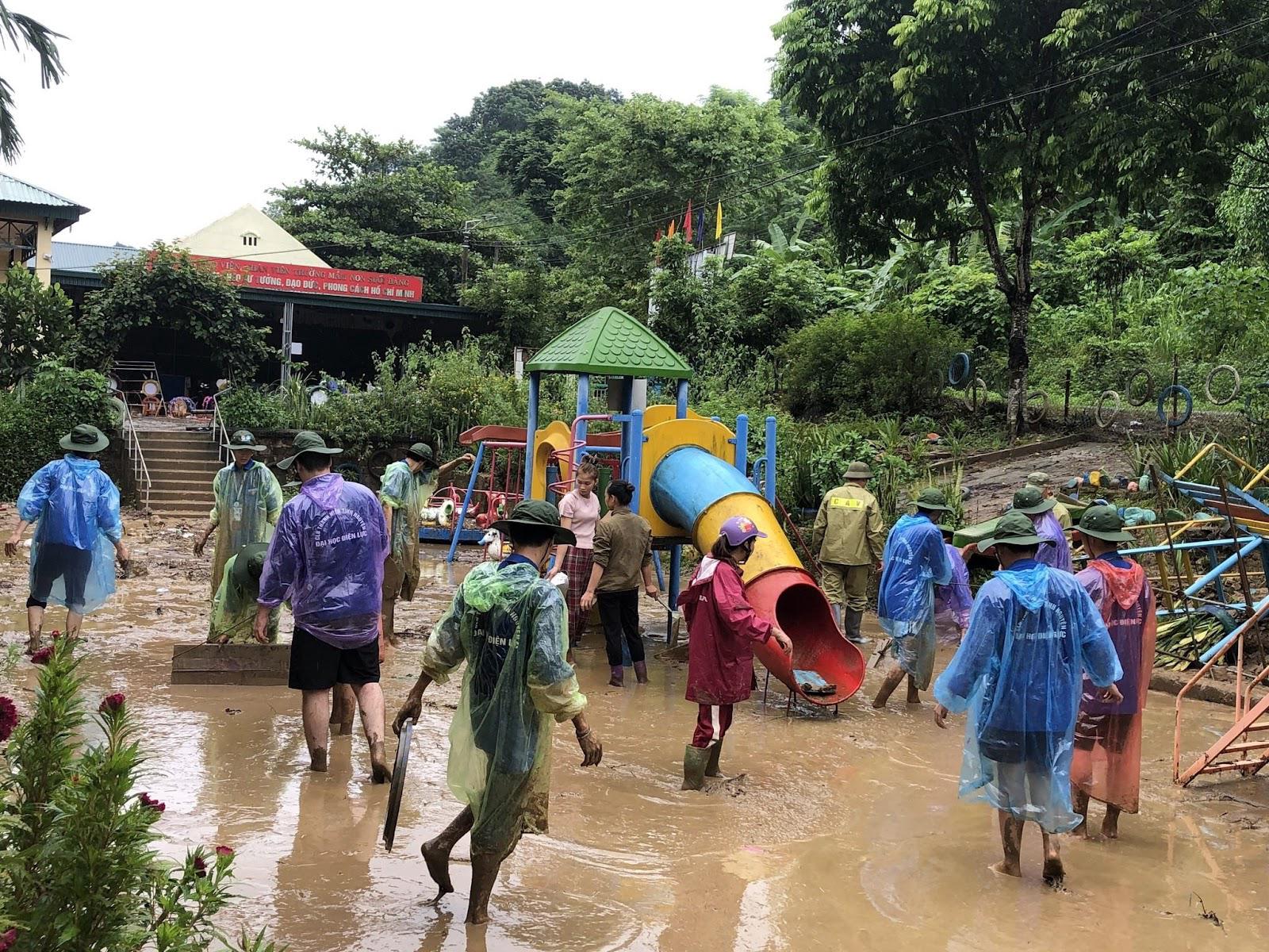 Sinh viên Trường Đại học Điện lực cùng chính quyền và bà con nhân dân xã Suối Bàng khắc phục hậu quả sau đợt mưa lũ… Ảnh: ĐHĐL
