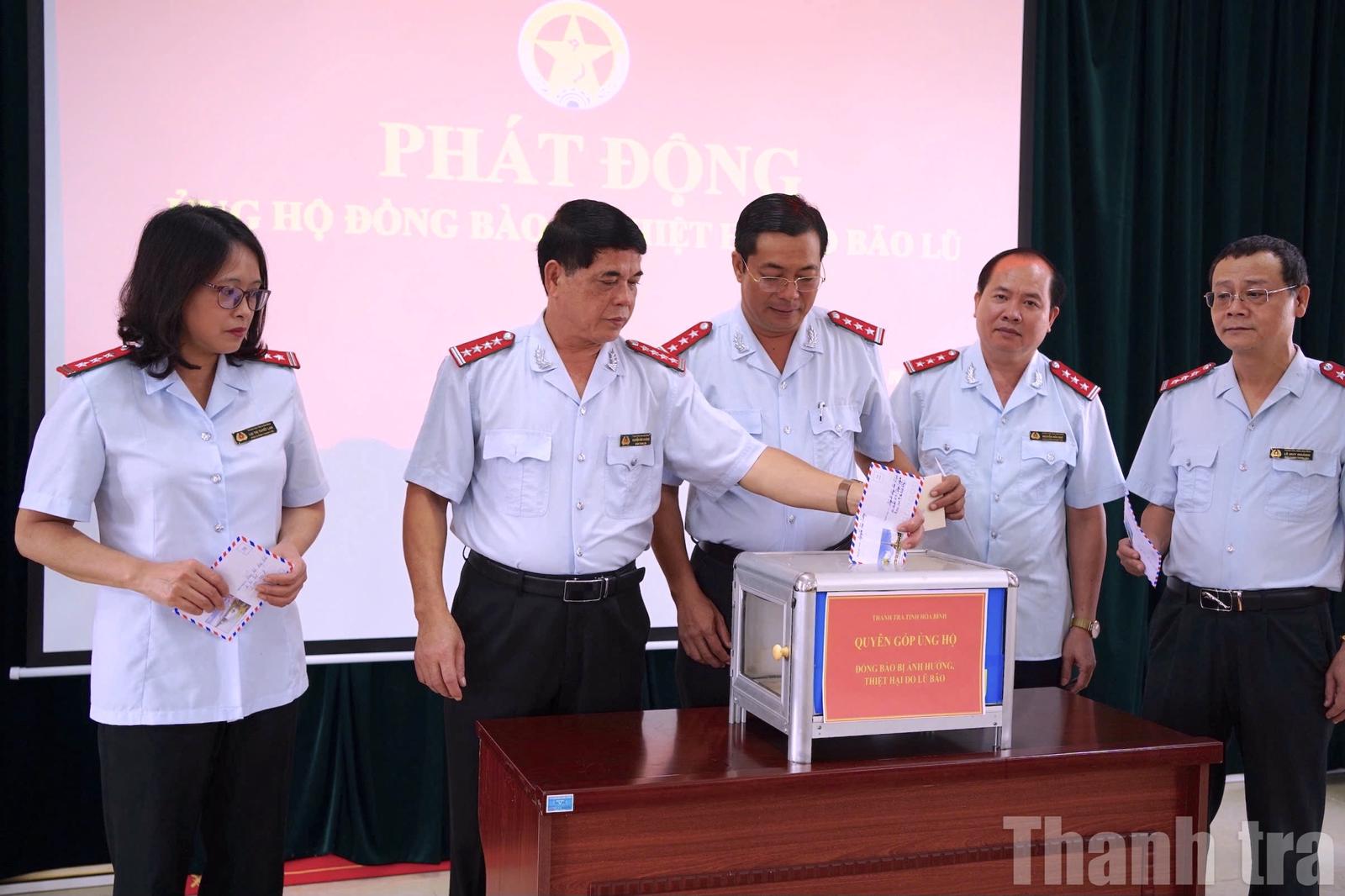 Ông Phạm Tiến Dũng cùng lãnh đạo Thanh tra tỉnh tích cực quyên góp ủng hộ đồng bào bị thiệt hại do ảnh hưởng của bão lũ. Ảnh: TK