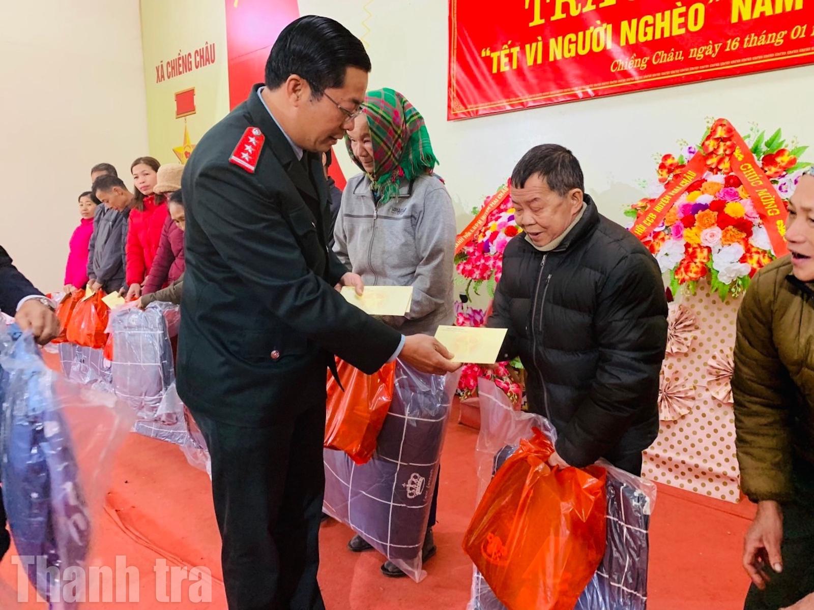Ông Phạm Tiến Dũng phát quà Tết cho người nghèo, hộ gia đình có hoàn cảnh khó khăn xã Chiềng Châu. Ảnh: TK