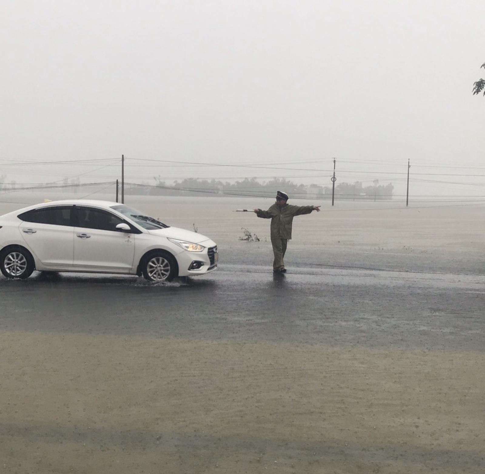 Thanh tra GTVT Quảng Nam hướng dẫn phương tiện qua các điểm ngập lũ. Ảnh: P.T