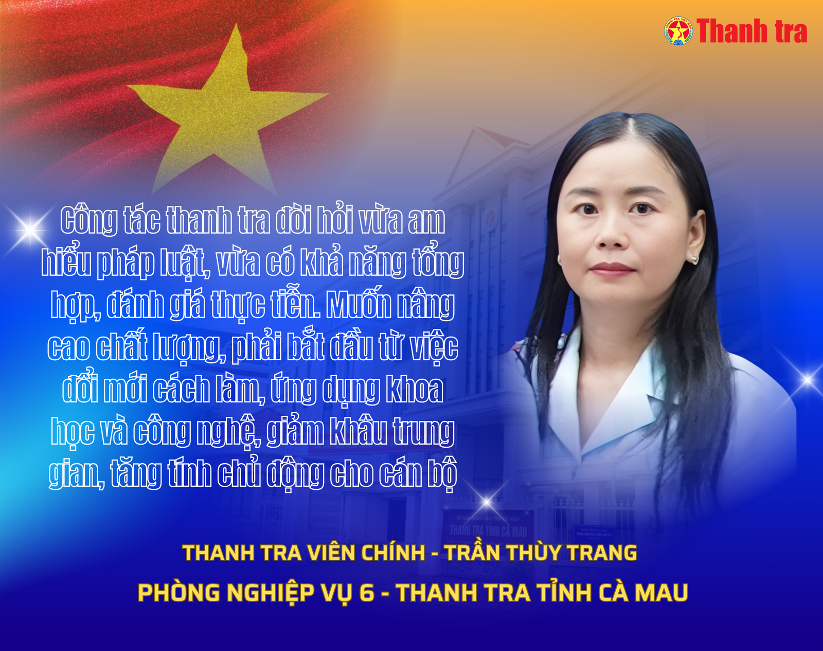 “Công việc thanh tra đòi hỏi vừa am hiểu pháp luật, vừa có khả năng tổng hợp, đánh giá thực tiễn. Muốn nâng cao chất lượng, phải bắt đầu từ việc đổi mới cách làm, ứng dụng khoa học và công nghệ, giảm khâu trung gian, tăng tính chủ động cho cán bộ”, chị Trang chia sẻ giản dị.