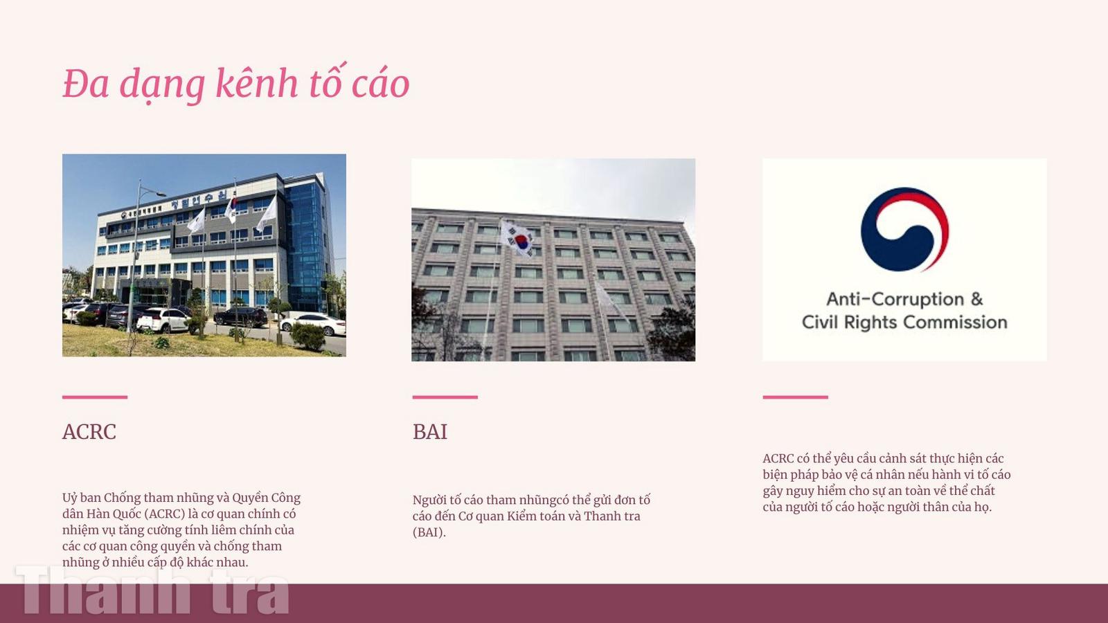 Đối với tố cáo tham nhũng, người tố cáo có thể gửi đơn tố cáo đến một trong các cơ quan: ACRC, các cơ quan điều tra và Cơ quan Kiểm toán và Thanh tra (BAI).