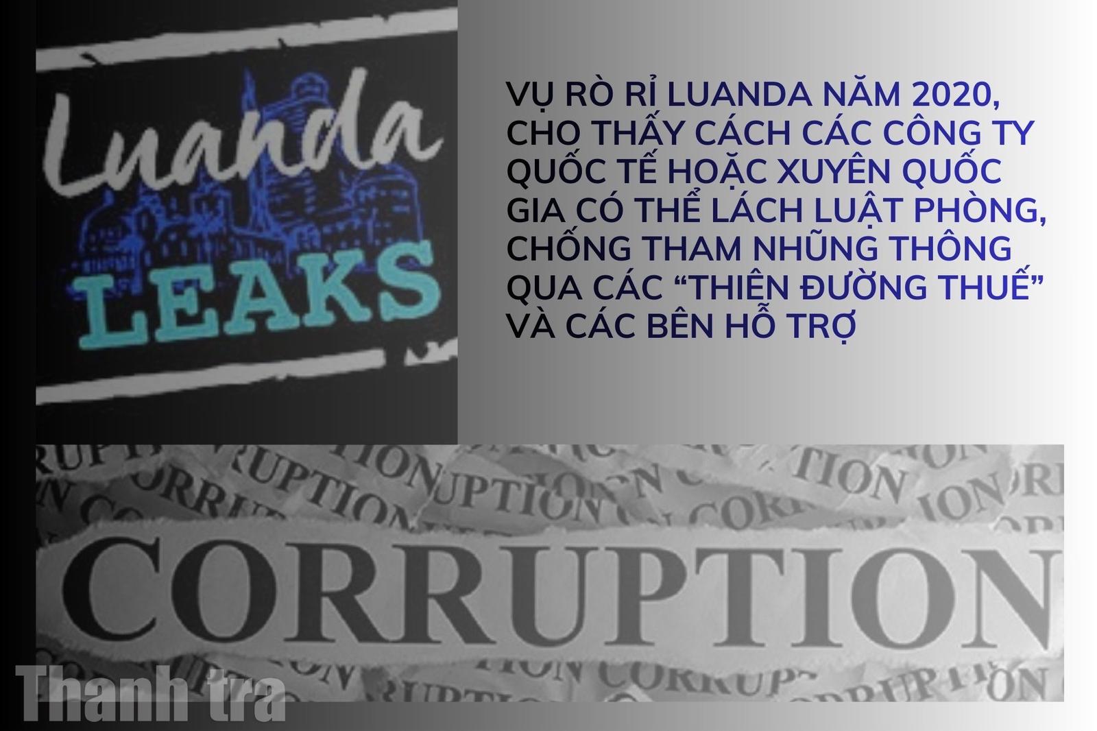 Các vụ tham nhũng phức tạp, chẳng hạn như vụ rò rỉ Luanda năm 2020, cho thấy cách các công ty quốc tế hoặc xuyên quốc gia có thể lách luật phòng, chống tham nhũng thông qua các “thiên đường thuế” và các bên hỗ trợ (như công ty kiểm toán, công ty luật và nhà cung cấp dịch vụ doanh nghiệp thuộc nhóm "Big Four").