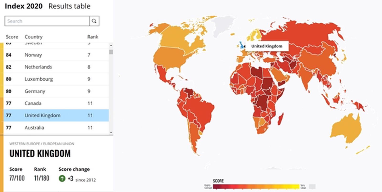 Năm 2020, Anh đạt 77 điểm CPI (thang điểm 100), xếp thứ 11/180 quốc gia