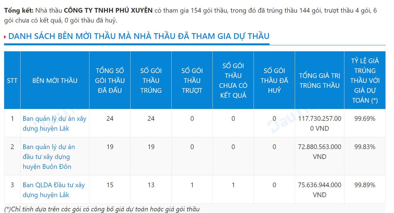Với Ban QLDA huyện Lắk, nhà thầu Phú Xuyên dự 24 gói thầu và trúng cả, với tổng giá trị trúng thầu 117.730.257.000 đồng, tỷ lệ giá trúng thầu với giá dự toán là 99.69%.
