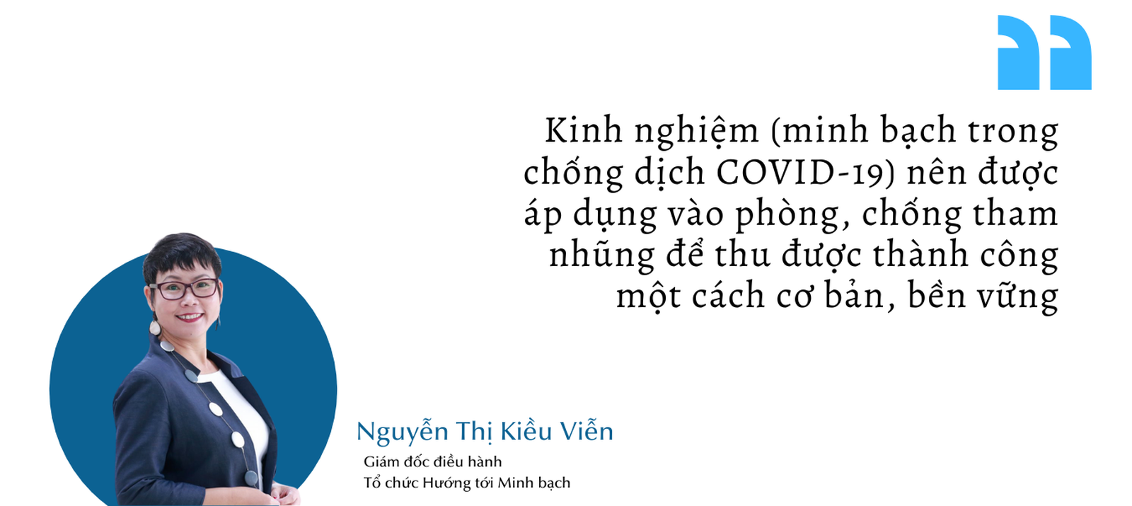 Bà Nguyễn Thị Kiều Viễn, Giám đốc Điều hành TT chia sẻ: “Trong năm 2020, Việt Nam đã đạt được những thành công đáng khích lệ và tạo được sự đồng thuận lớn giữa Nhà nước và người dân trong công tác kiểm soát dịch COVID-19 nhờ thông tin minh bạch và kịp thời. Điều này cho thấy, việc bảo đảm tính minh bạch, liêm chính, trách nhiệm giải trình và sự tham gia của người dân là chìa khóa gắn kết xã hội, tăng cường niềm tin của người dân vào lãnh đạo, nhà nước và chính quyền. Kinh nghiệm này nên được áp dụng vào phòng, chống tham nhũng để thu được thành công một cách cơ bản, bền vững”.