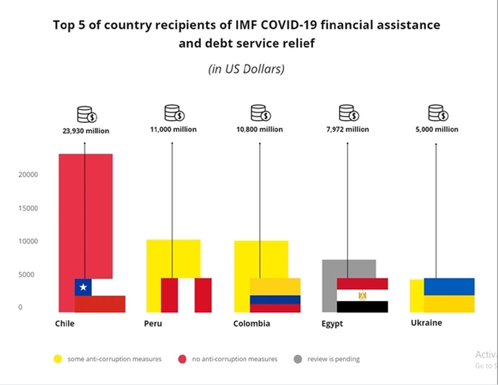 Một bảng phân tích cập nhật đến ngày 23/7/2020 chỉ ra rằng, 80% tổng số tiền được IMF giải ngân đã chỉ được chuyển đến 10 quốc gia gồm: Chile, Peru, Colombia, Ai Cập, Ukraine, Nigeria, Pakistan, Jordan, Ghana và Tunisia. Khoảng hơn một nửa (58%) trong số các thỏa thuận tài chính có bao gồm các biện pháp cụ thể để bảo đảm tính minh bạch và/hoặc giảm thiểu rủi ro tham nhũng.