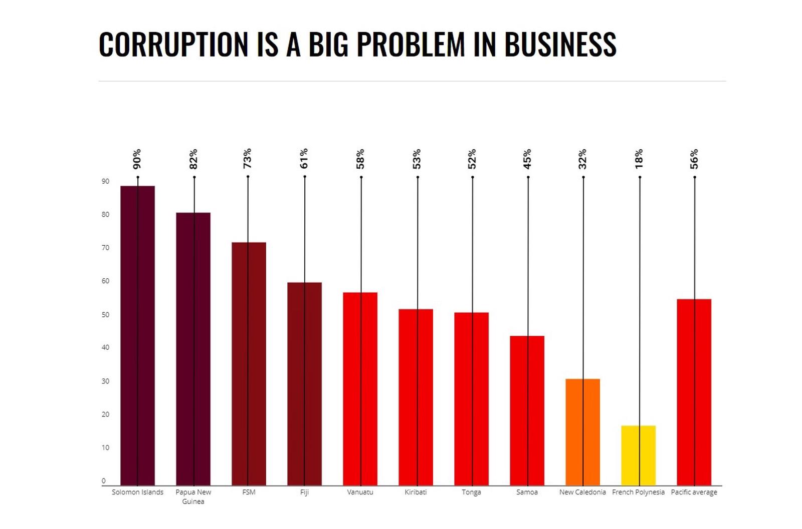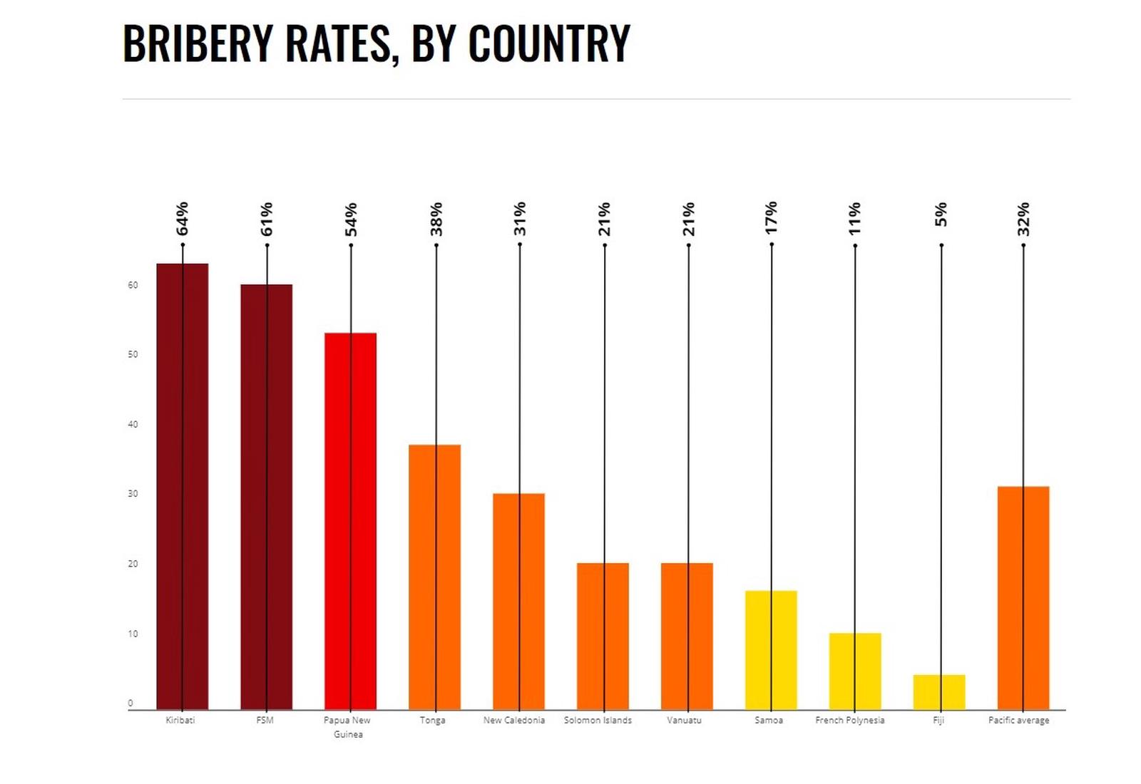 Cộng hòa Kiribati dẫn đầu về hối lộ với 64% số người được hỏi cho biết đã phải lót tay khi tiếp cận dịch vụ công trong 1 năm qua; tiếp đến là Liên bang Micronesia (61%), Papua New Guinea (54%), Tonga (38%), New Caledonia (31%), Solomon Islands (21%), Vanuatu (21%), Samoa (17%), Polynesia thuộc Pháp (11%) và thấp nhất là Fiji (5%).