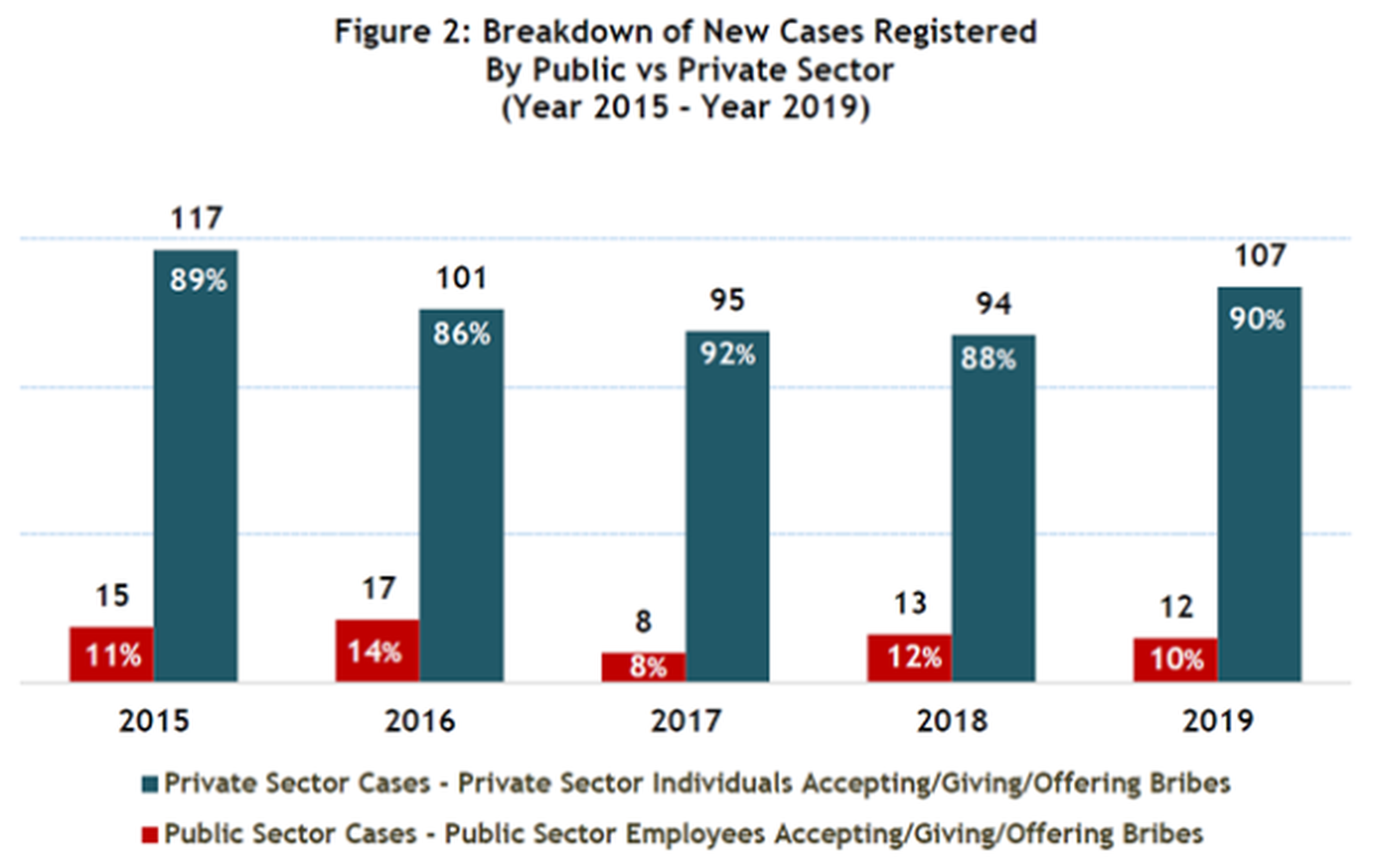 Năm 2019, các vụ việc tham nhũng thuộc lĩnh vực tư tiếp tục chiếm phần lớn các vụ được đăng ký để điều tra, ở mức 90%.