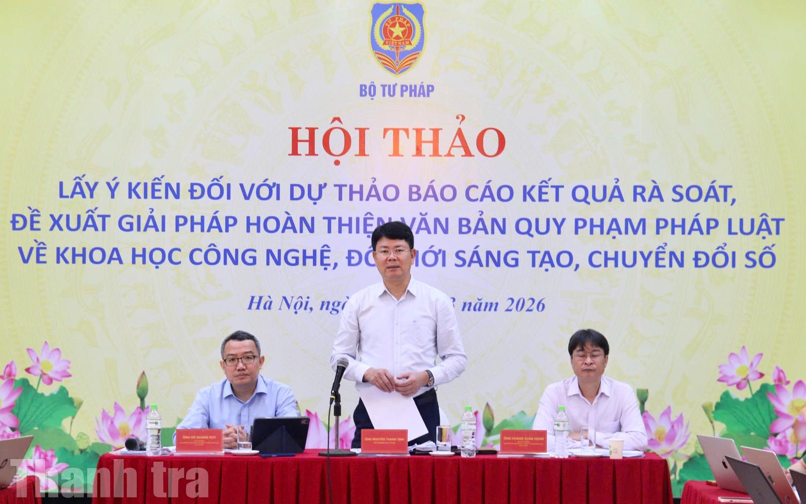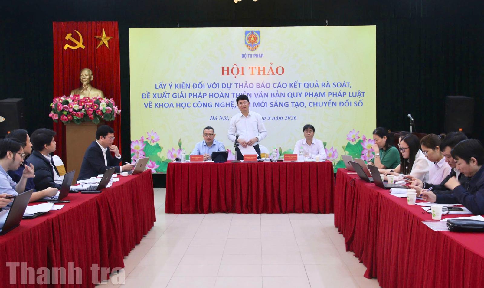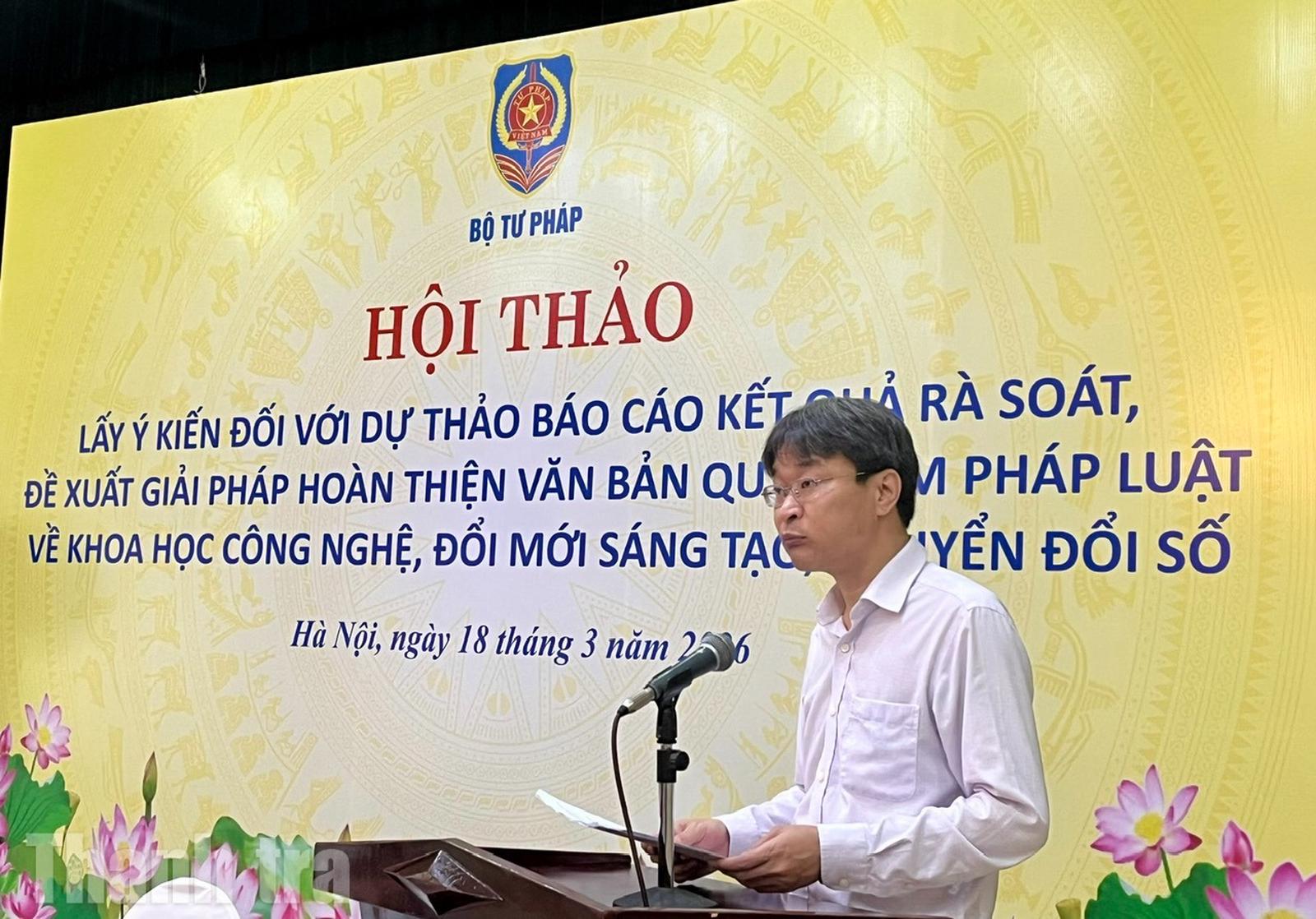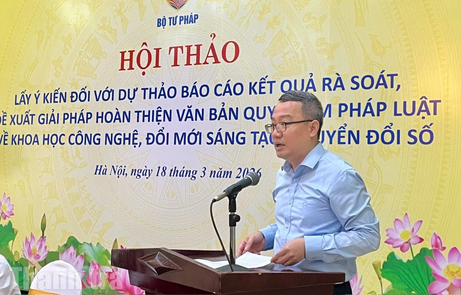 Sáng 18/3, Bộ Tư pháp tổ chức hội thảo lấy ý kiến đối với dự thảo báo cáo Kết quả rà soát, đề xuất giải pháp hoàn thiện văn bản quy phạm pháp luật về khoa học công nghệ, đổi mới sáng tạo, chuyển đổi số.