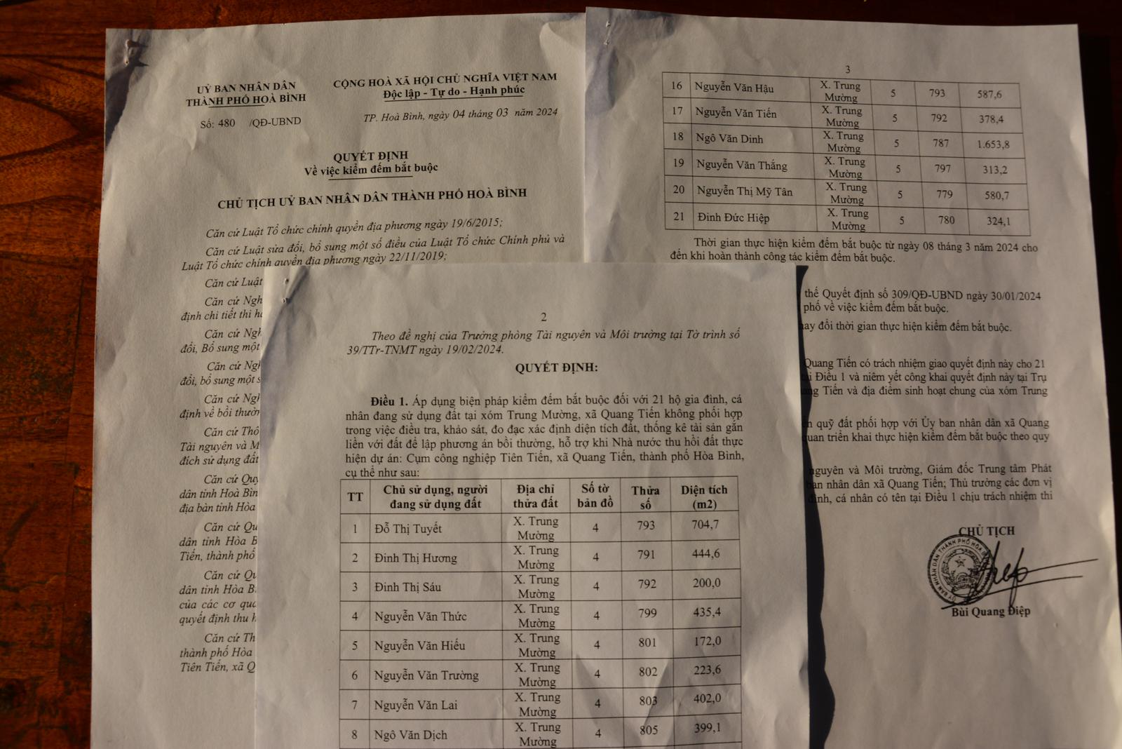 Sau khi các hộ không chấp hành Quyết định số 480/QĐ-UBND TP Hòa Bình, chiểu theo khoản 3 Điều 31, Quyết định số 08/2024/QĐ-UBND của UBND tỉnh Hòa Bình “ban hành quy định về bồi thường, hỗ trợ, tái định cư khi nhà nước thu hồi đất trên địa bàn tỉnh Hòa Bình”, Trung tâm Phát triển quỹ đất TP Hòa Bình phối hợp với UBND xã Quang Tiến đã tổng hợp sơ bộ lập hồ sơ về đất, tài sản gắn liền trên đất của các hộ gửi UBND TP Hòa Bình, xem xét ban hành quyết định “cưỡng chế kiểm đếm bắt buộc” đối với 21 hộ dân xóm Trung Mường.