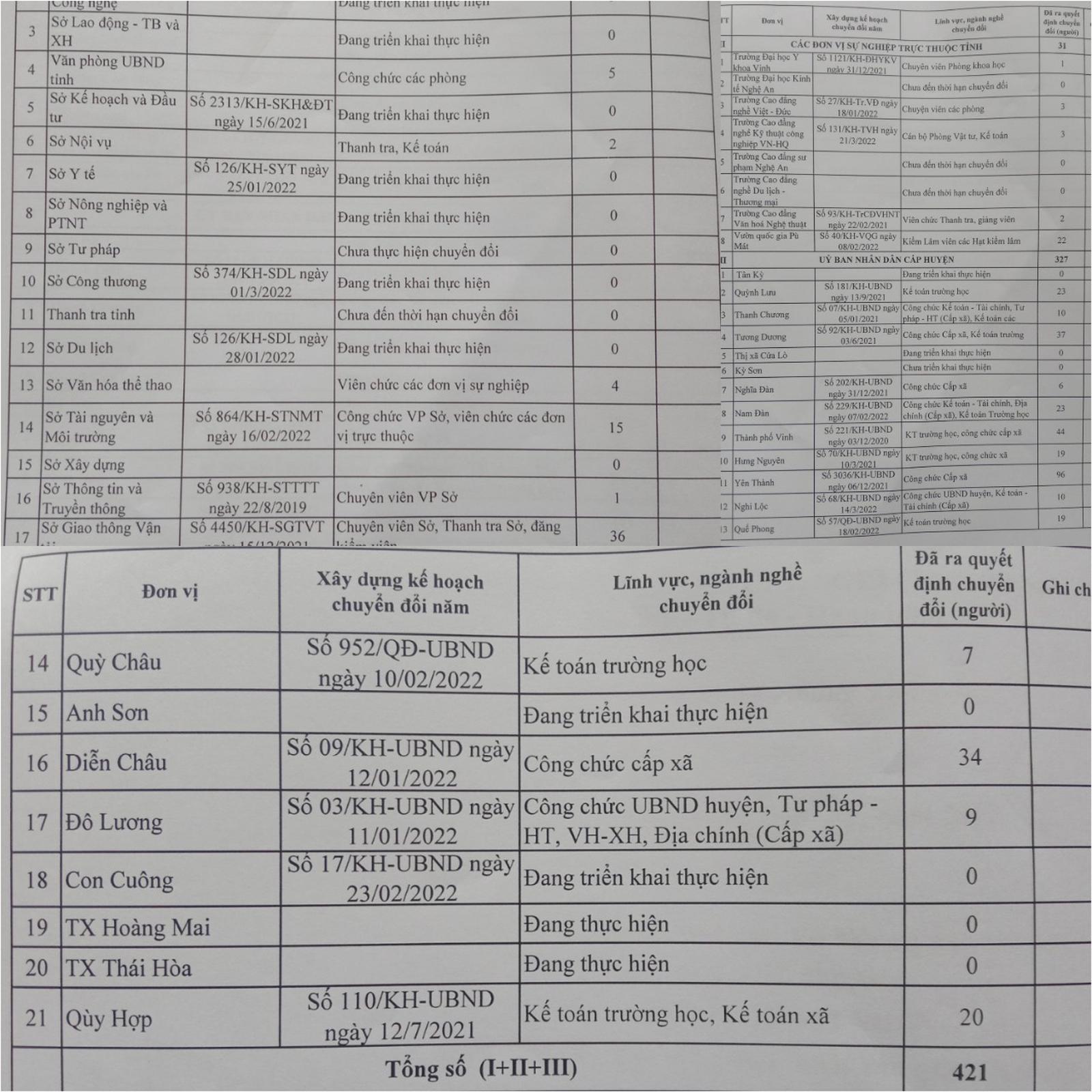 Cụ thể, trong tổng số 21 đơn vị là các sở, ban, ngành cấp tỉnh chỉ có 5 đơn vị triển khai thực hiện đã ra quyết định chuyển đổi 63 trường hợp (trong đó, Văn phòng UBND tỉnh 5 người, Sở Nội vụ 2 người, Sở Văn hóa- Thể thao 4 người, Sở Tài nguyên và Môi trường 15 người, Sở Thông tin và Truyền thông 1 người, Sở Giao thông Vận tải 36 người), 3 đơn vị chưa thực hiện chuyển đổi (Sở Tư pháp, Ban Dân tộc và Ban quản lý Khu kinh tế Đông Nam), còn lại đang triển khai và chưa đến thời hạn chuyển đổi; 8 đơn vị sự nghiệp trực thuộc tỉnh có 5 đơn vị đã thực hiện 31 trường hợp (Trường Đại học Y khoa Vinh 1 người, Trường Cao đẳng nghề Việt - Đức 3 người, Trường Cao đẳng Kỹ thuật công nghệ Việt Nam - Hàn Quốc 3 người, Trường Cao đẳng Văn hóa- Nghệ thuật 2 người và Vườn Quốc gia Pù Mát 22 người) và 21 huyện, thành, thị đã chuyển đổi 327 trường hợp, trong đó 14 địa phương đã triển khai, 6 huyện, thị đang triển khai thực hiện và 1 địa phương (huyện Kỳ Sơn) chưa triển khai.