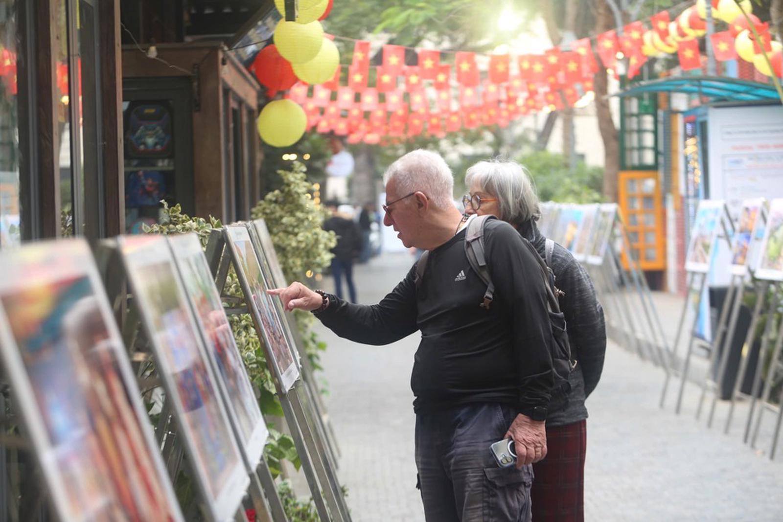 Du khách nước ngoài xem trưng bày ảnh với chủ đề “Hà Nội vươn mình bứt phá” do Báo Kinh tế & Đô thị tổ chức tại Phố Sách Hà Nội