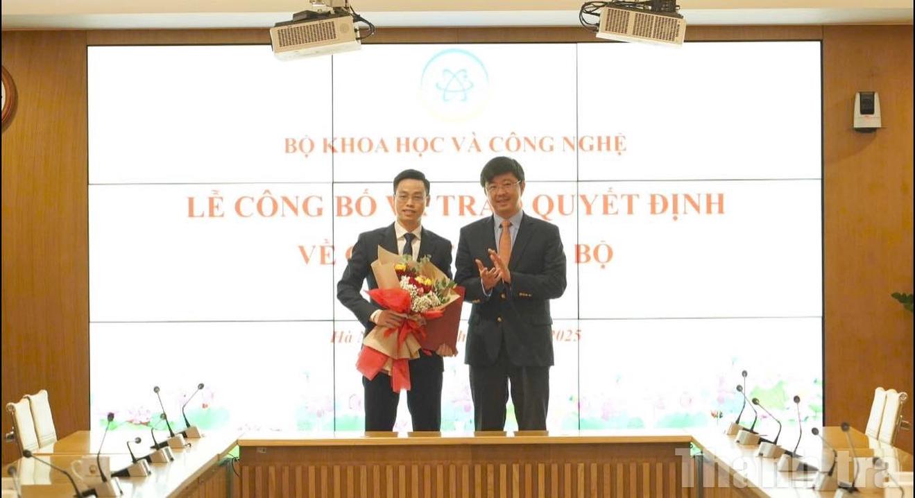 Thứ trưởng Bộ KH&CN Bùi Hoàng Phương trao quyết định điều động, bổ nhiệm và tặng hoa cho ông Trần Quang Hưng. Ảnh: ND
