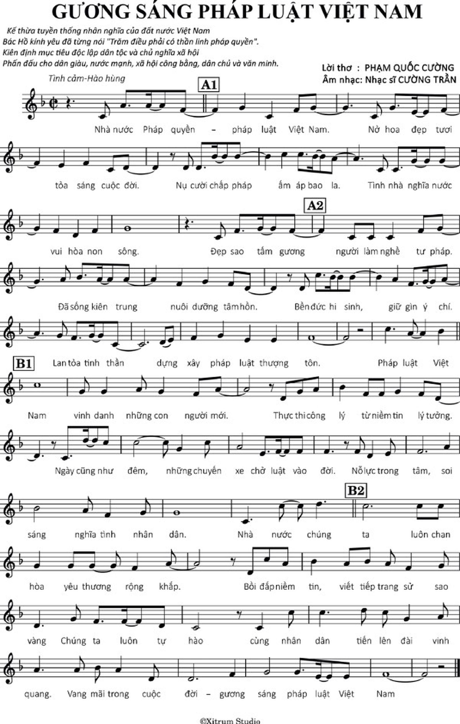 Đây là ca khúc hùng tráng, lan toả tinh thần thượng tôn pháp luật được ra mắt đúng vào dịp Bộ Tư pháp và Báo Pháp luật Việt Nam tổ chức Chương trình bình chọn, tôn vinh “Gương sáng Pháp luật” vào Ngày Pháp luật Việt Nam một năm trước đây.