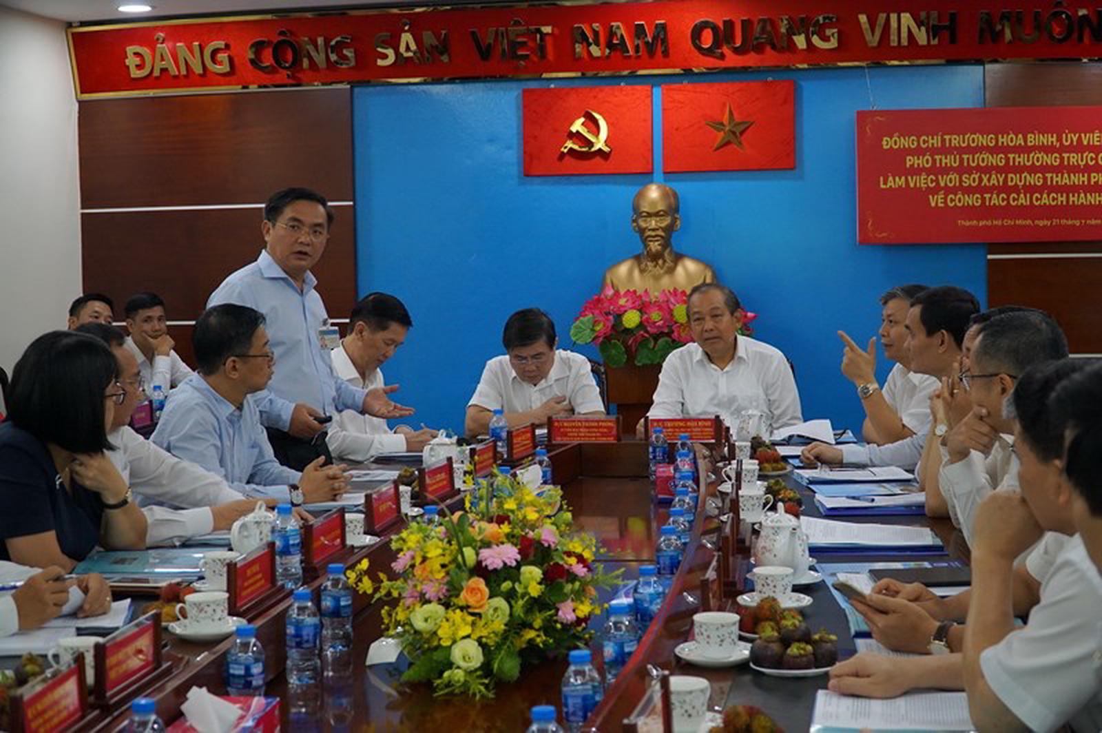 Ông Trần Trọng Tuấn, Giám đốc Sở Xây dựng TP HCM, báo cáo với Phó Thủ tướng vấn đề nổi bật về cải cách thủ tục hành chính, đó là, Sở đã được TP chấp thuận cho thí điểm việc gộp 3 thủ tục trong quy trình cấp phép xây dựng (CPXD) thuộc thẩm quyền của Sở nộp chung một lần.