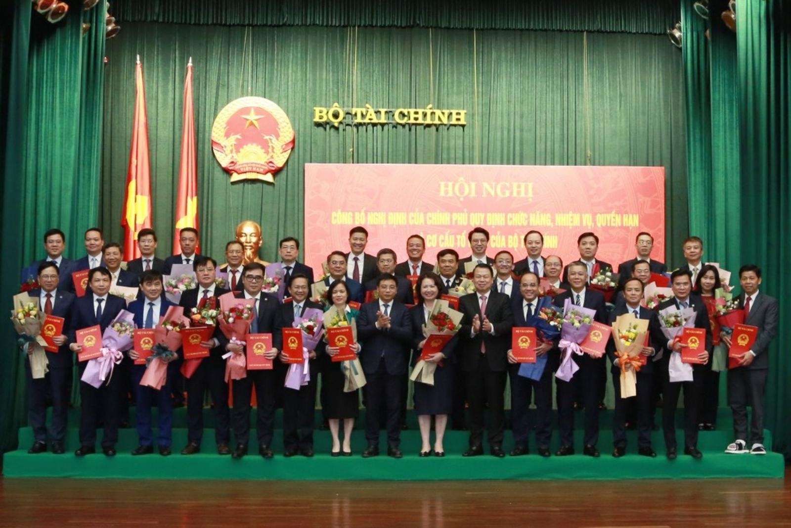 Lãnh đạo Bộ Tài chính trao quyết định và chúc mừng lãnh đạo cấp trưởng các đơn vị thuộc Bộ. Ảnh: TC.