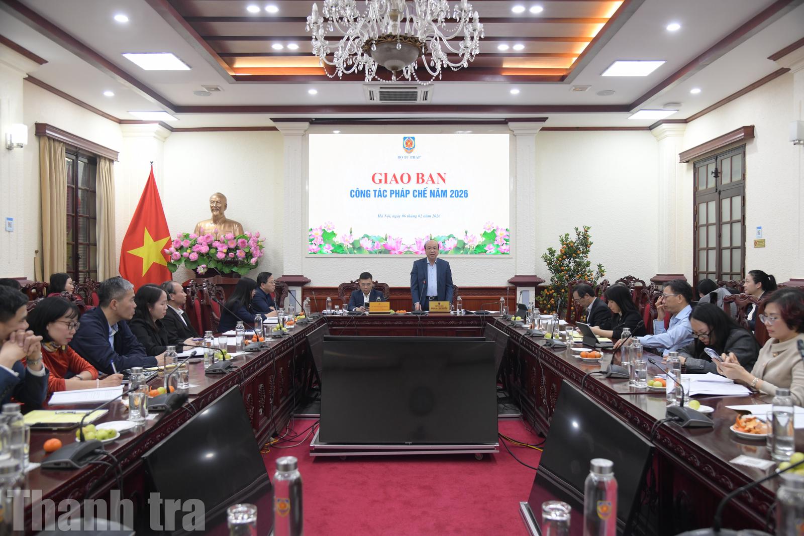 (Thanh tra) - Ngày 6/2, Bộ Tư pháp tổ chức hội nghị giao ban công tác pháp chế năm 2026. Thứ trưởng Bộ Tư pháp Phan Chí Hiếu và Vụ trưởng Vụ Công tác xây dựng văn bản quy phạm pháp luật Nguyễn Quốc Hoàn đồng chủ trì hội nghị.