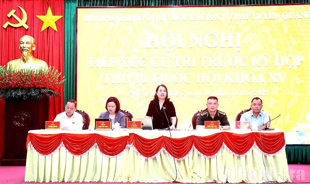 Mở đầu tại buổi tiếp xúc, Đoàn Đại biểu Quốc hội khóa XV tỉnh Tuyên Quang thông tin về dự kiến chương trình Kỳ họp thứ 10, Quốc hội khóa XV, dự kiến khai mạc vào ngày 20/10 và bế mạc vào ngày 12/12, sẽ xem xét, thông qua 42 luật và 3 nghị quyết.