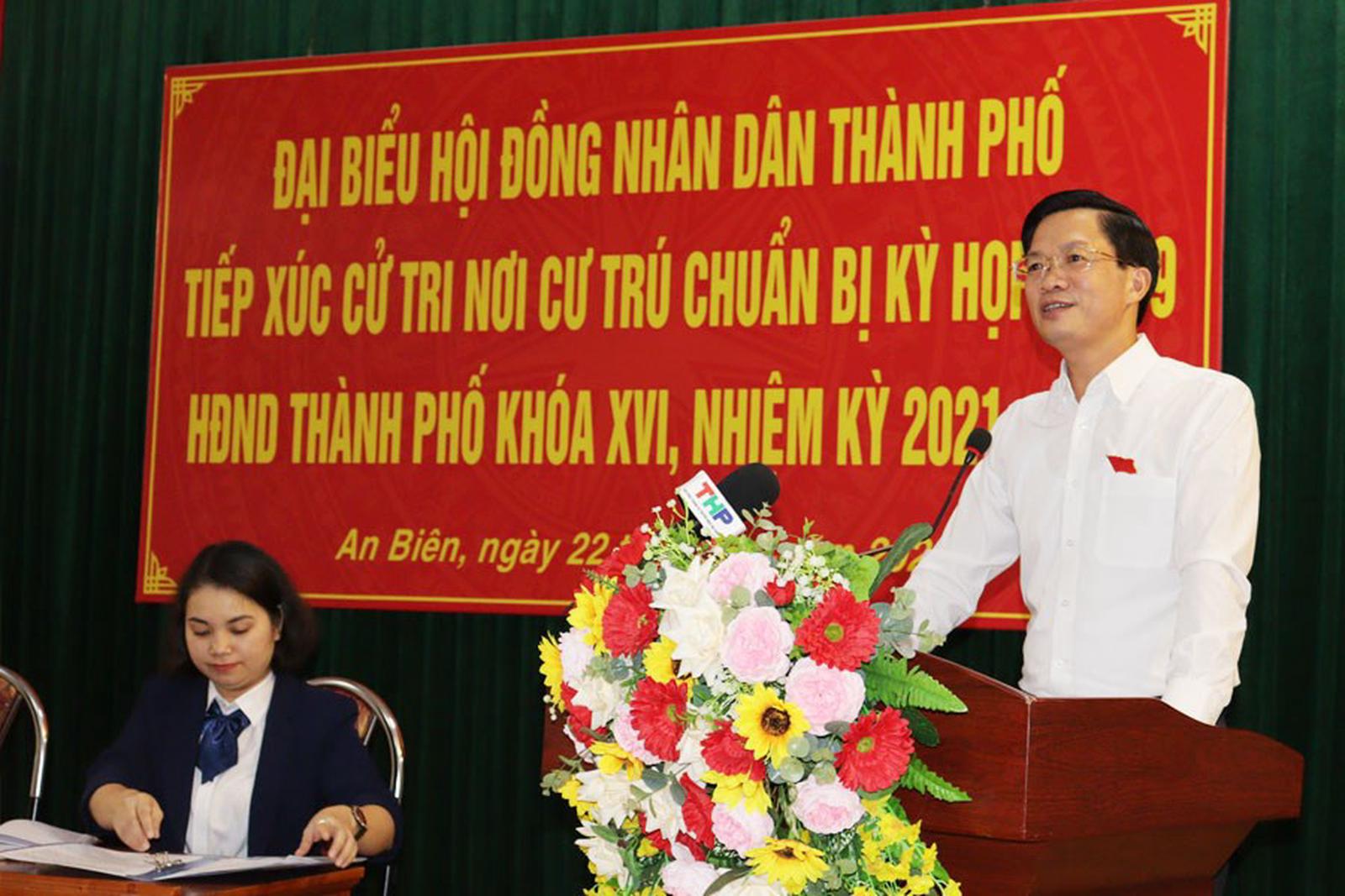 Tại buổi tiếp xúc, Trưởng Ban Tuyên giáo Thành ủy Đào Khánh Hà, thông tin tới cử tri phường An Biên tình hình kinh tế xã hội trong thời gian qua và một số nội dung trong thời gian tới dự kiến sẽ được HĐND thành phố xem xét, quyết định và thông qua tại Kỳ họp thứ 9.