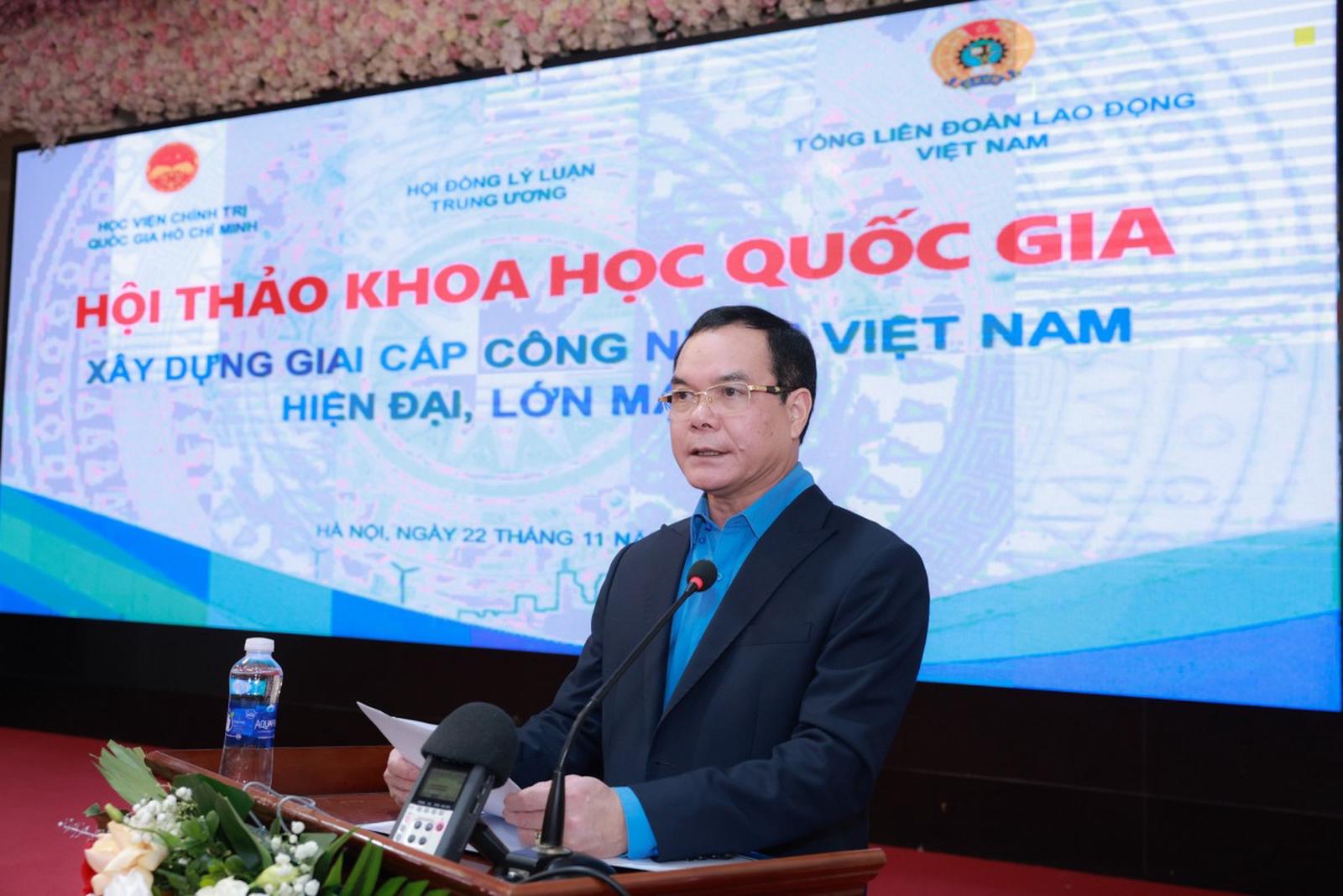Chủ tịch Tổng LĐLĐ Việt Nam Nguyễn Đình Khang nhấn mạnh: “Tổng LĐLĐ Việt Nam mong rằng, từ kết quả của hội thảo sẽ khơi gợi, hình thành một số giải pháp cơ bản, trọng tâm nhằm xây dựng giai cấp công nhân Việt Nam hiện đại, lớn mạnh trong bối cảnh hiện nay. Trên cơ sở đó, hình thành một số kiến nghị với Đảng, Nhà nước về một số chủ trương, chính sách mang tính căn bản, có tính cách mạng, đột phá, nhằm tạo sức bật mạnh mẽ cho lực lượng lao động, xây dựng giai cấp công nhân Việt Nam thực sự hiện đại, lớn mạnh, để sẵn sàng bước vào kỷ nguyên mới, kỷ nguyên vươn mình của dân tộc”.