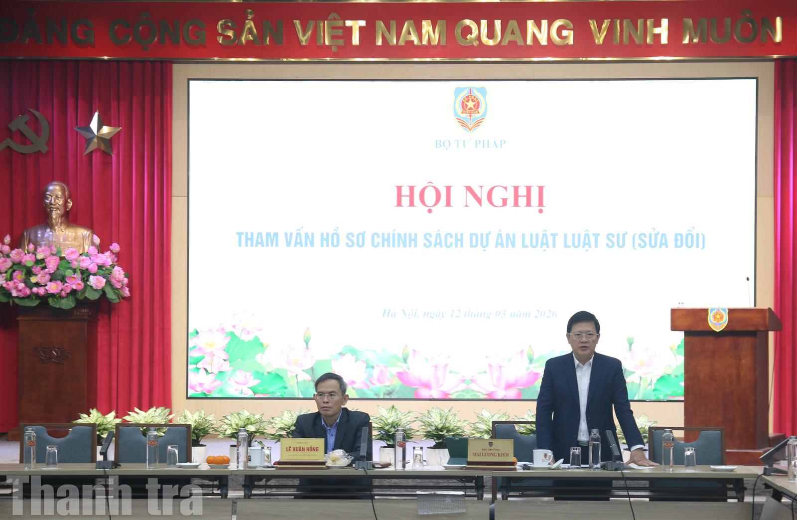 (Thanh tra) - Sáng 12/3, Bộ Tư pháp tổ chức hội nghị tham vấn chính sách dự án Luật Luật sư (sửa đổi), dưới sự đồng chủ trì của Thứ trưởng Mai Lương Khôi và Cục trưởng Cục Bổ trợ Tư pháp Lê Xuân Hồng.