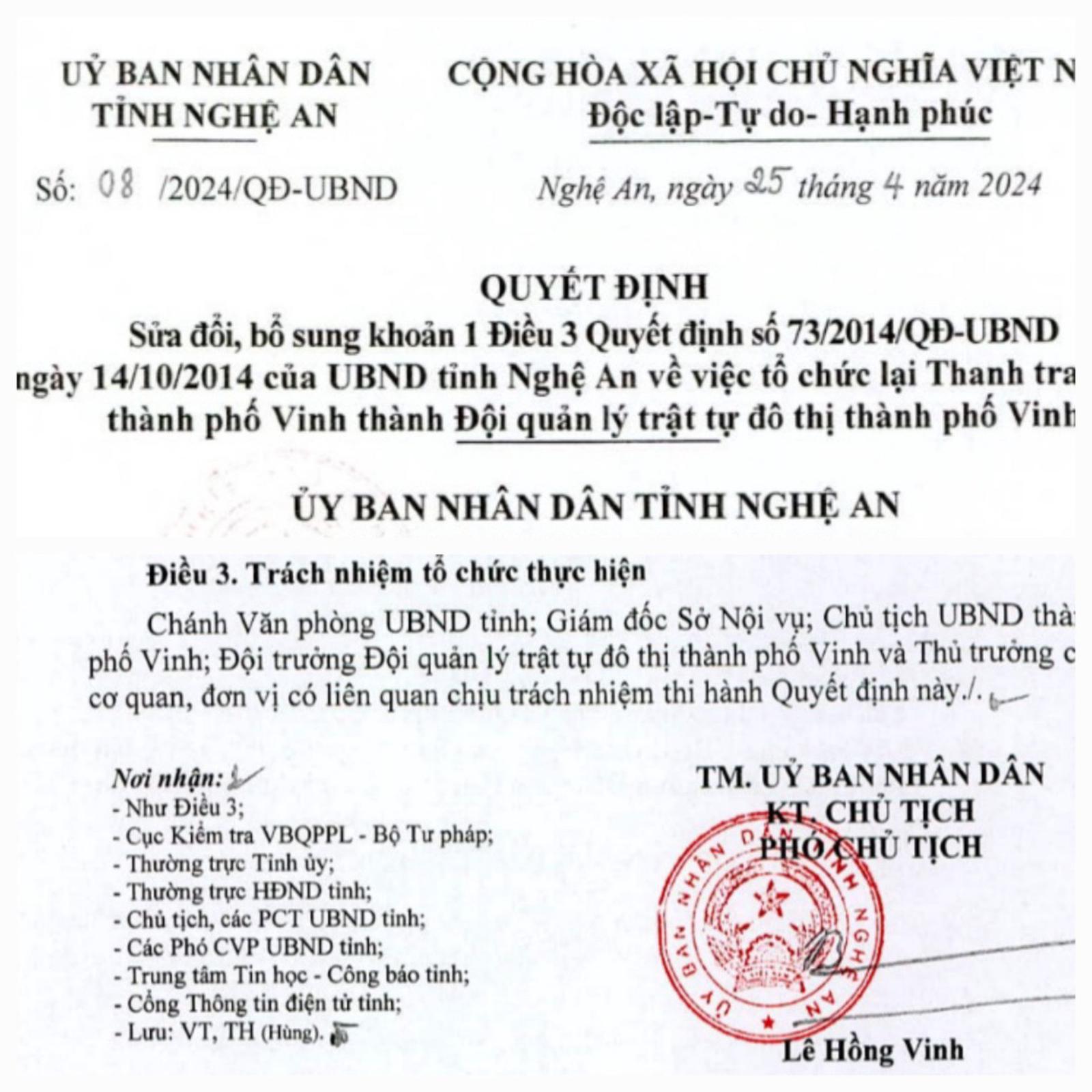 Theo Quyết định số 08/2024/QĐ-UBND ngày 25/4/2024 của UBND tỉnh Nghệ An, từ 10/5/2024, Đội Quản lý trật tự đô thị TP Vinh (tiền thân là Thanh tra Đô thị) sẽ có bổ sung về cơ cấu bộ máy gồm đội trưởng và 2 phó đội trưởng, tổ chức bộ máy là viên chức hoạt động, tham mưu trực tiếp với lãnh đạo đơn vị (thay vì dưới lãnh đạo có các bộ phận chuyên môn, nghiệp vụ).