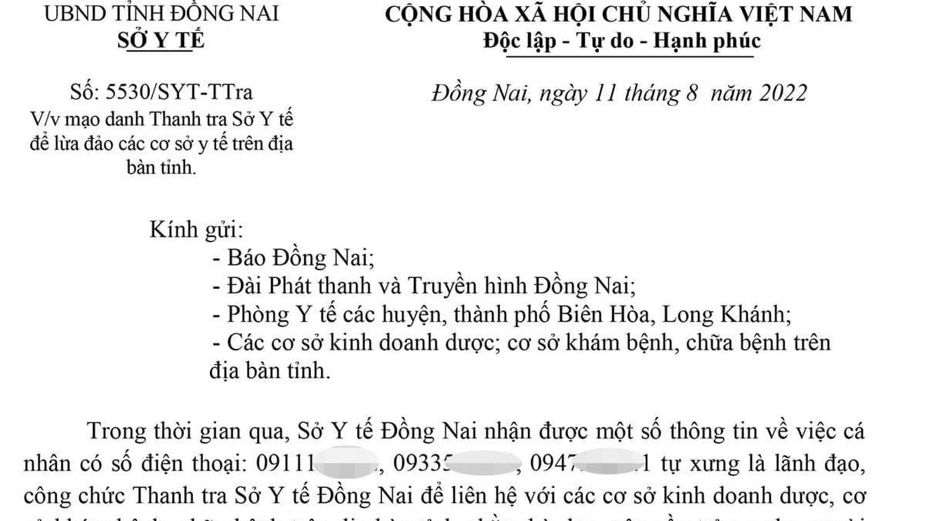 Phó Giám đốc phụ trách Sở Y tế Đồng Nai Lê Quang Trung vừa ký văn bản cảnh báo tình trạng có người mạo danh Thanh tra Sở Y tế để lừa đảo các cơ sở y tế trên địa bàn với mục đích hù dọa, yêu cầu trả nợ.