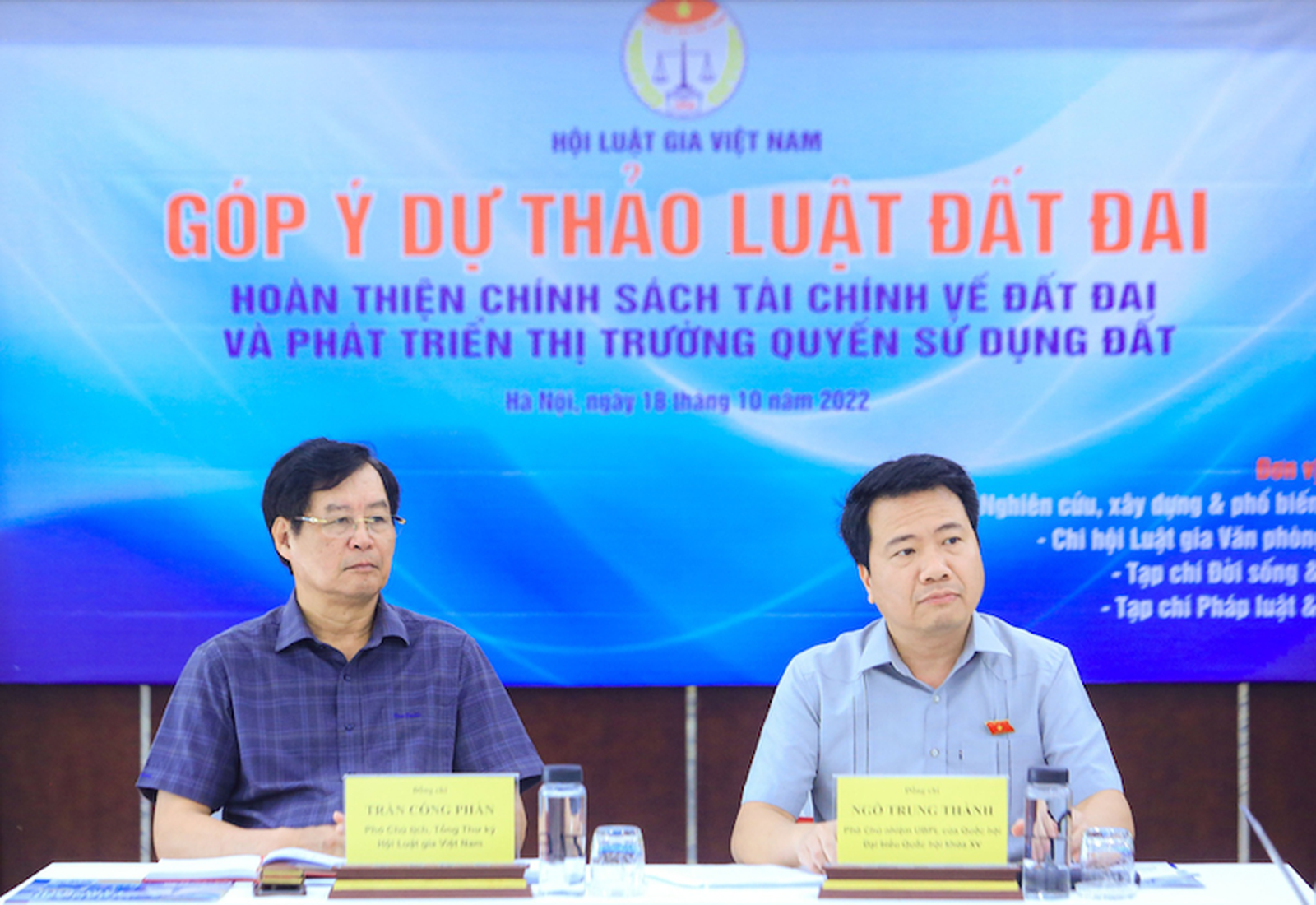 Hội thảo về chính sách tài chính đất đai do ông Trần Công Phàn, Phó Chủ tịch - Tổng Thư ký Hội Luật gia Việt Nam và ông Ngô Trung Thành, Phó Chủ nhiệm Ủy ban Pháp luật Quốc hội chủ trì. Ảnh: Đ.X