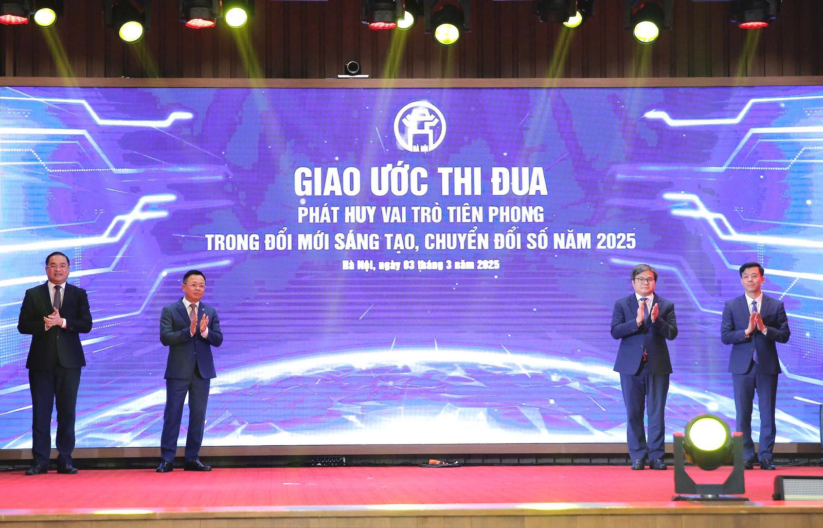 Để thi đua sâu rộng trong các cơ quan Đảng, Nhà nước và đoàn thể, khẳng định vai trò đầu tàu của Thủ đô trong công cuộc đổi mới sáng tạo và chuyển đổi số, Văn phòng Thành ủy, Văn phòng Đoàn đại biểu Quốc hội và HĐND thành phố, Văn phòng UBND thành phố và Trung tâm Phục vụ hành chính công thành phố đã ký giao ước thi đua thể hiện quyết tâm vận hành và sử dụng hiệu quả các ứng dụng dùng chung 3 cấp.