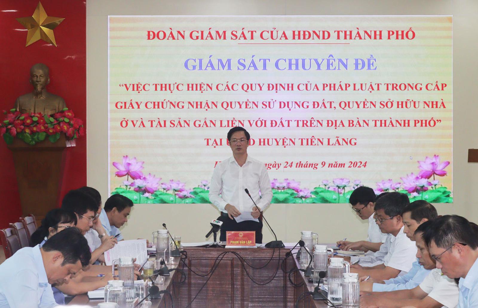 Ngày 24/9, đoàn giám sát chuyên đề của HĐND thành phố Hải Phòng về thực hiện các quy định của pháp luật trong cấp giấy chứng nhận quyền sử dụng đất (GCNQSDĐ), quyền sở hữu nhà ở và tài sản gắn liền với đất trên địa bàn làm việc với UBND huyện Tiên Lãng.