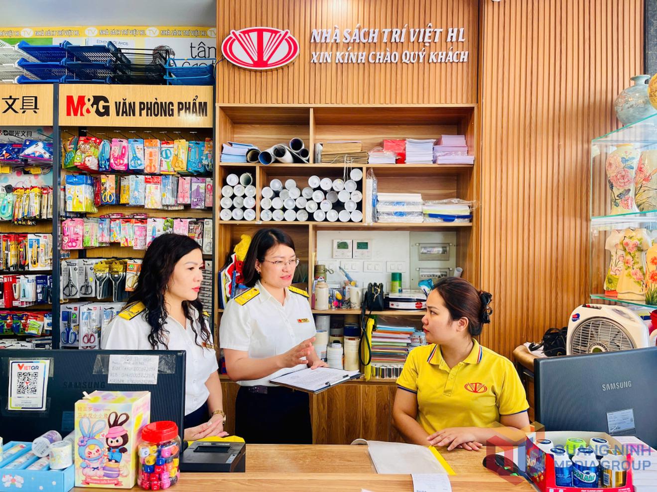 Cán bộ Đội thuế Hạ Long hướng dẫn thực hiện hóa đơn điện tử khởi tạo từ máy tính tiền tại Nhà sách Trí Việt (phường Trần Hưng Đạo, TP Hạ Long). Ảnh: TTTT