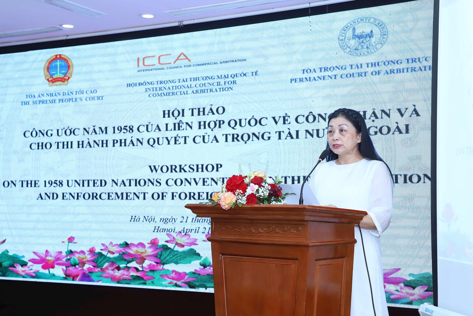 Phát biểu khai mạc hội thảo, Thẩm phán TAND Tối cao Lương Ngọc Trâm cho biết, việc tổ chức Hội thảo có ý nghĩa thiết thực và kịp thời. Đây không chỉ là diễn đàn học thuật để cập nhật, trao đổi kiến thức chuyên sâu về Công ước năm 1958, mà còn là cơ hội để đội ngũ Thẩm phán, Thư ký Tòa án Việt Nam, đặc biệt là tại các TAND khu vực, tiếp cận kinh nghiệm quốc tế, nâng cao năng lực chuyên môn, kỹ năng thực tiễn trong giải quyết loại việc đặc thù.
