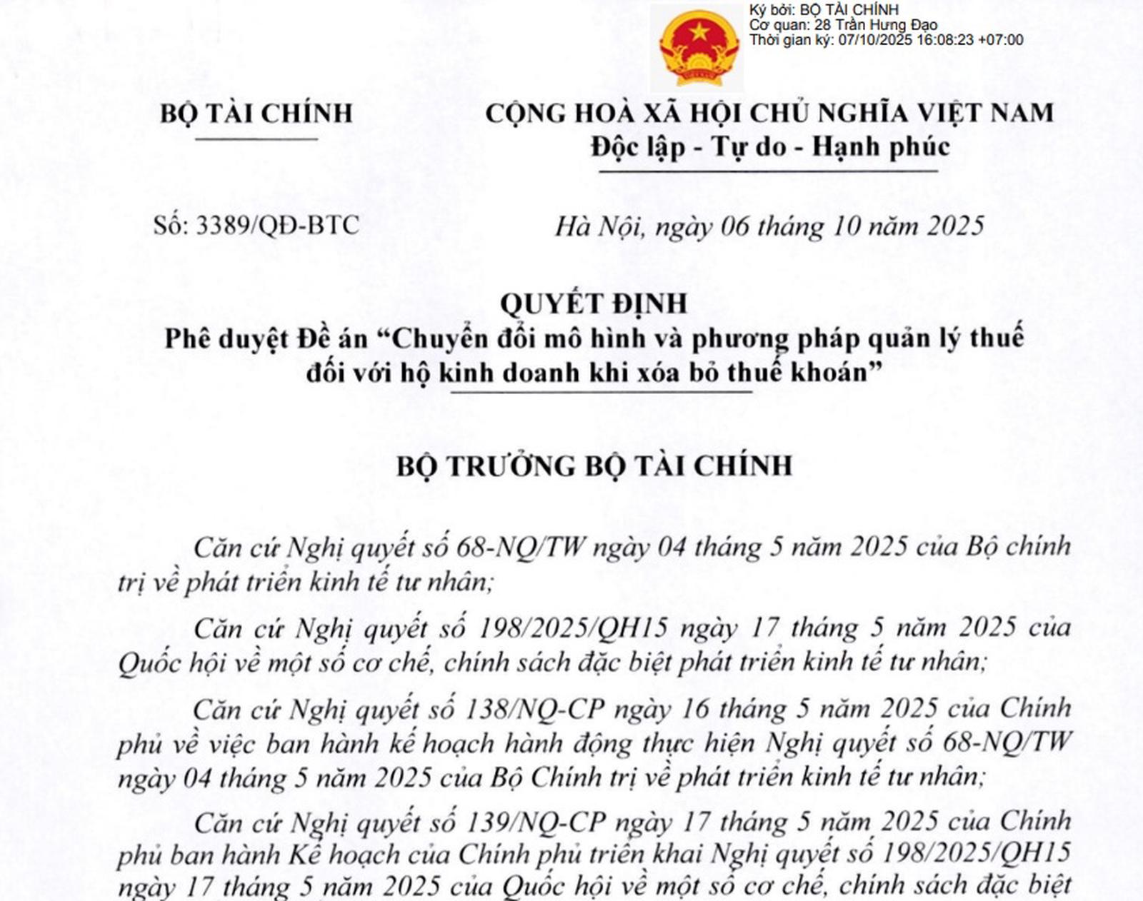 Bộ Tài chính vừa có Quyết định 3389/QĐ-BTC phê duyệt Đề án “Chuyển đổi mô hình và phương pháp quản lý thuế đối với hộ kinh doanh khi xóa bỏ thuế khoán”. Đây được đánh giá là một trong những bước đi trọng tâm của chương trình cải cách quản lý thuế giai đoạn 2025 - 2030.