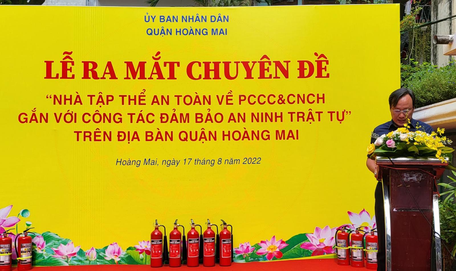 Phát biểu tại buổi lễ, ông Đỗ Thanh Tùng – Phó Chủ tịch UBND quận Hoàng Mai, Phó trưởng Ban chỉ đạo 197 quận cho hay, việc thành lập chuyên đề “Nhà tập thể an toàn về PCCC&CNCH gắn với công tác đảm bảo an ninh trật tự” là thật sự cần thiết, qua đó giúp nâng cao ý thức người dân về công tác PCCC, hạn chế thấp nhất thiệt haị về người và tài sản.