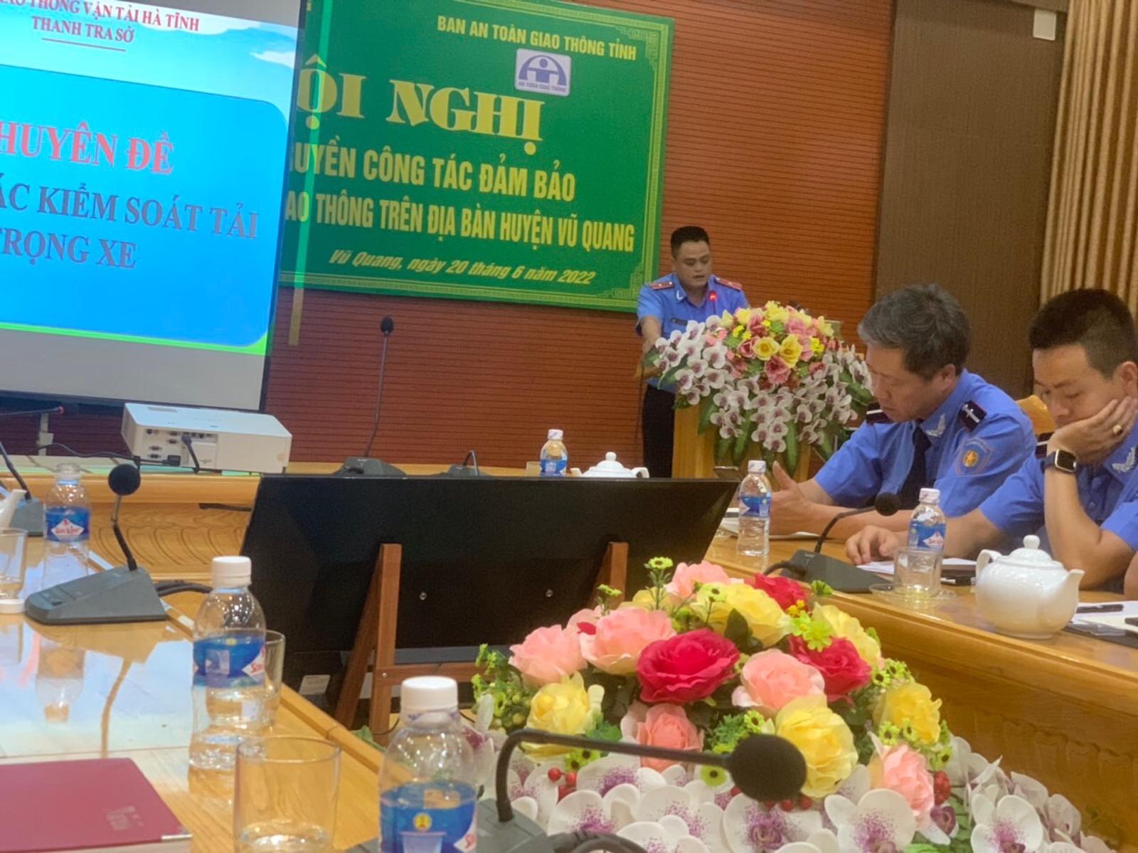 Buổi tập huấn giới thiệu 4 chuyên đề: Tình hình trật tự ATGT trên địa bàn tỉnh trong thời gian qua về đường bộ và đường thủy nội địa, giới thiệu các quy định mới của Chính phủ quy định xử phạt vi phạm hành chính trong lĩnh vực giao thông; tình hình quản lý xe quá tải, hành lang ATGT trên địa bàn tỉnh và các hành vi bị nghiêm cấm, kiểm tra xử lý các hành vi, vi phạm xe quá tải; đảm bảo ATGT tại đường sắt và các hành vi bị nghiêm cấm; các nội dung kế hoạch đảm bảo trật tự ATGT năm 2022 và kế hoạch của UBND huyện Vũ Quang về triển khai thu hẹp, giảm, xóa lối đi tự mở giao cắt với đường sắt quốc gia qua địa bàn huyện.