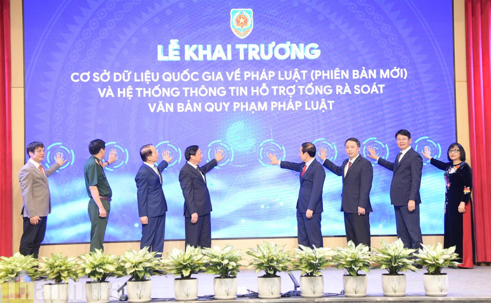 Các đại biểu ấn nút khai trương Cơ sở dữ liệu quốc gia về pháp luật (phiên bản mới), Hệ thống thông tin hỗ trợ tổng rà soát văn bản quy phạm pháp luật. Ảnh: Minh Nguyệt