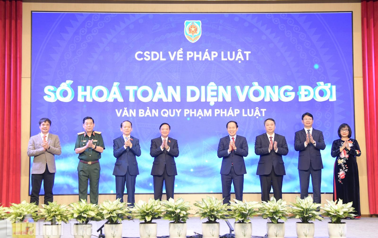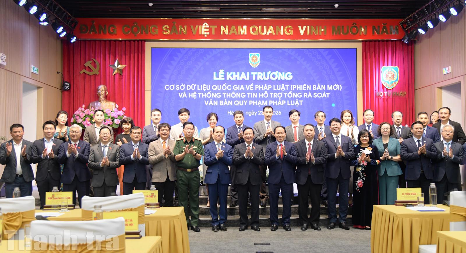 (Thanh tra) - Sáng ngày 23/4, Bộ Tư pháp tổ chức lễ khai trương Cơ sở dữ liệu quốc gia về pháp luật (phiên bản mới), Hệ thống thông tin hỗ trợ tổng rà soát văn bản quy phạm pháp luật. Dự lễ khai trương có Phó Chủ tịch Quốc hội Nguyễn Khắc Định; Phó Thủ tướng Chính phủ Lê Tiến Châu; Bộ trưởng Bộ Tư pháp Hoàng Thanh Tùng.