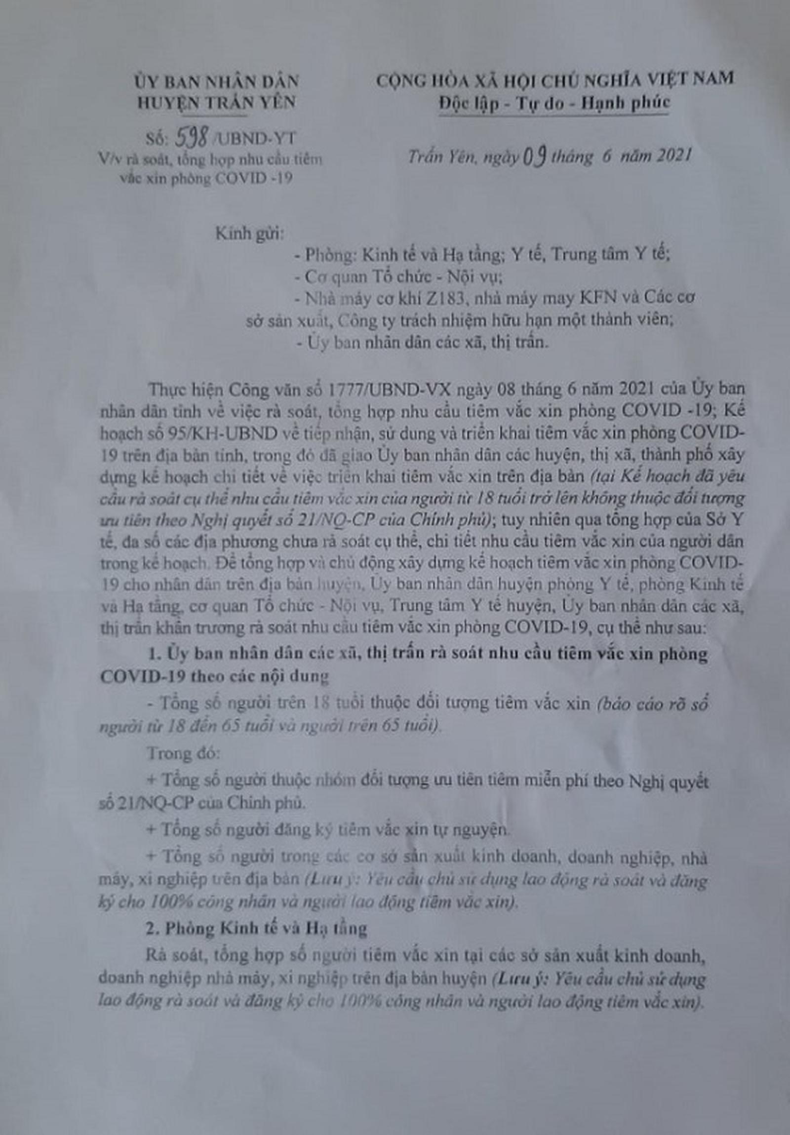 Văn bản về việc rà soát, tổng hợp nhu cầu tiêm vắc xin Covid-19 của UBND huyện Trấn Yên. Ảnh: Bùi Bình