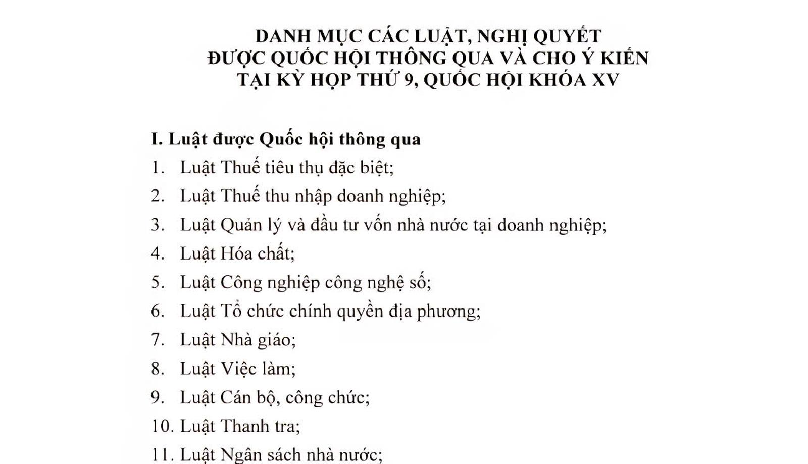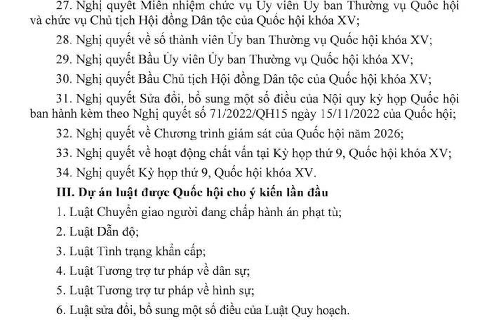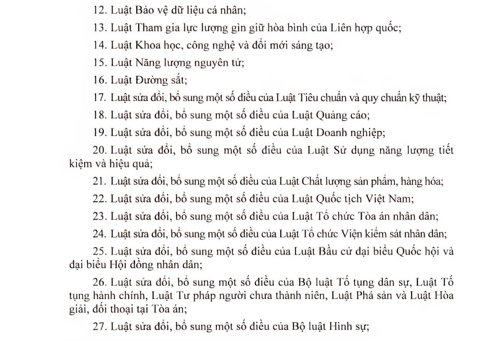 Danh mục 34 luật, 34 nghị quyết thông qua và 6 dự án luật cho ý kiến lần đầu. Ảnh: TM