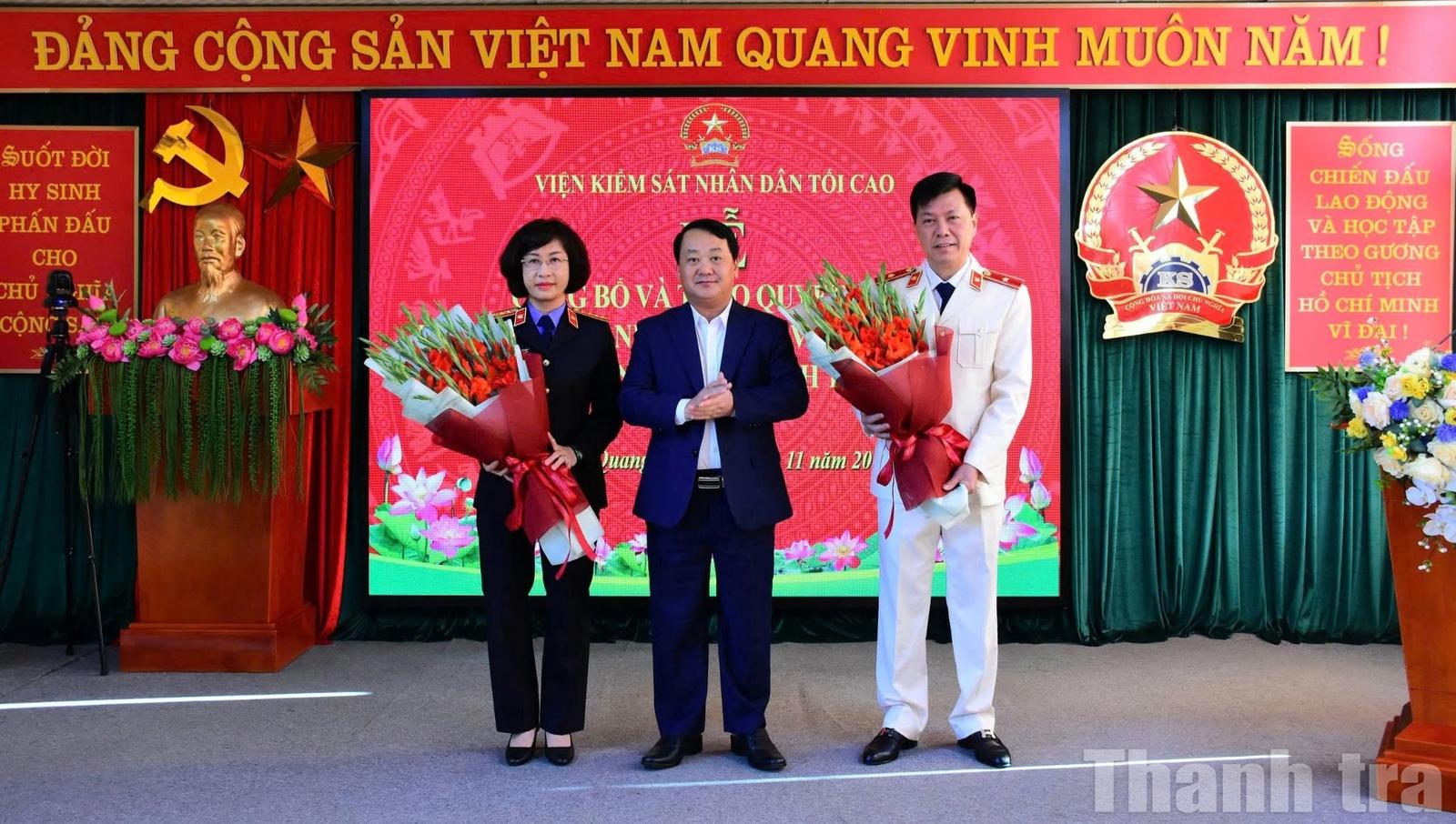 Phó Viện trưởng VKSND tối cao Nguyễn Văn Giảng trao quyết định điều động, bổ nhiệm chức vụ Viện trưởng VKSND tỉnh Tuyên Quang đối với ông Lý Văn Huấn. Ảnh: ND