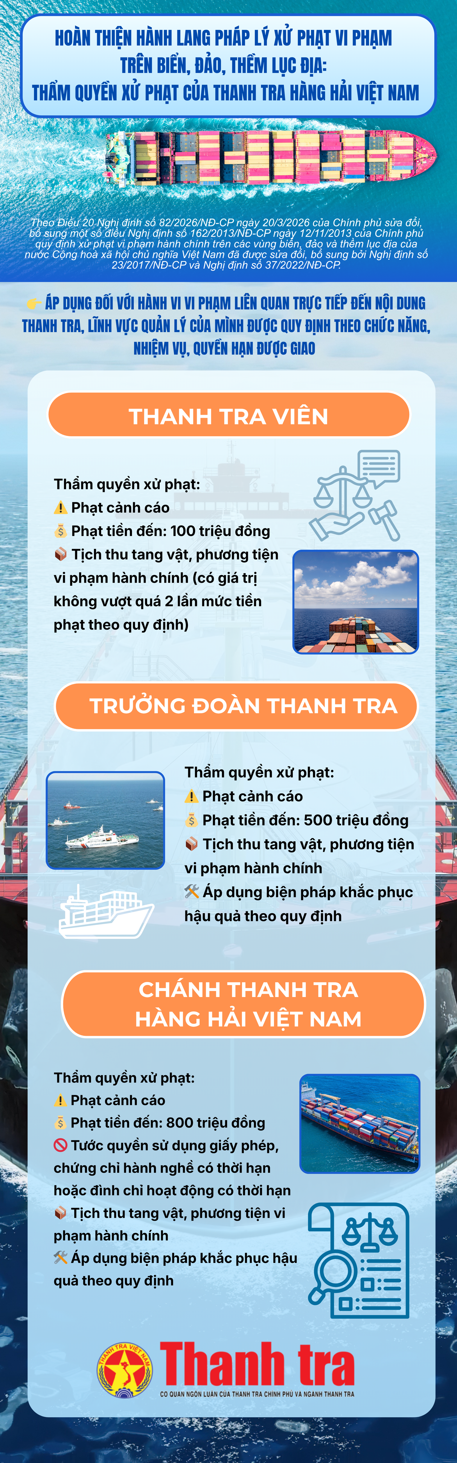 (Thanh tra) - Theo Nghị định số 82/2026/NĐ-CP mới được Chính phủ ban hành, thẩm quyền xử phạt vi phạm hành chính của Thanh tra Hàng hải Việt Nam đã được quy định chi tiết theo từng chức danh cụ thể. Việc phân định rõ ràng các mức phạt tiền, quyền tịch thu tang vật và áp dụng biện pháp khắc phục hậu quả nhằm đảm bảo tính nghiêm minh và nâng cao hiệu lực quản lý Nhà nước đối với các hoạt động trên biển.