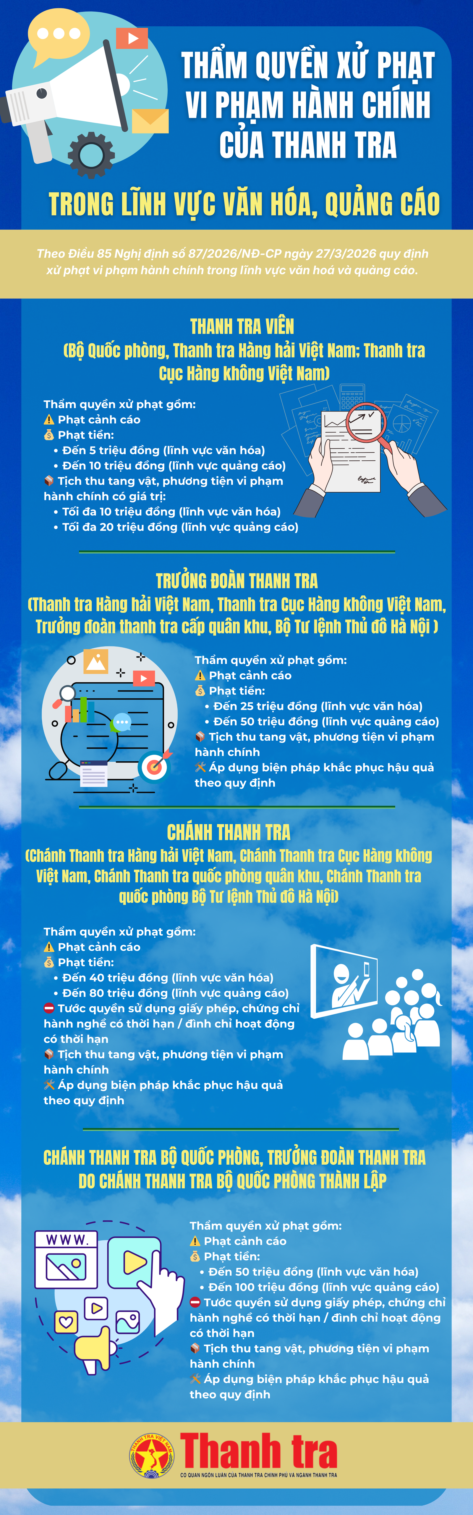 (Thanh tra) - Nghị định số 87/2026/NĐ-CP về xử phạt vi phạm hành chính trong lĩnh vực văn hóa và quảng cáo vừa được Chính phủ ban hành, trong đó quy định cụ thể thẩm quyền xử phạt của lực lượng thanh tra, chính thức có hiệu lực từ ngày 15/5/2026.