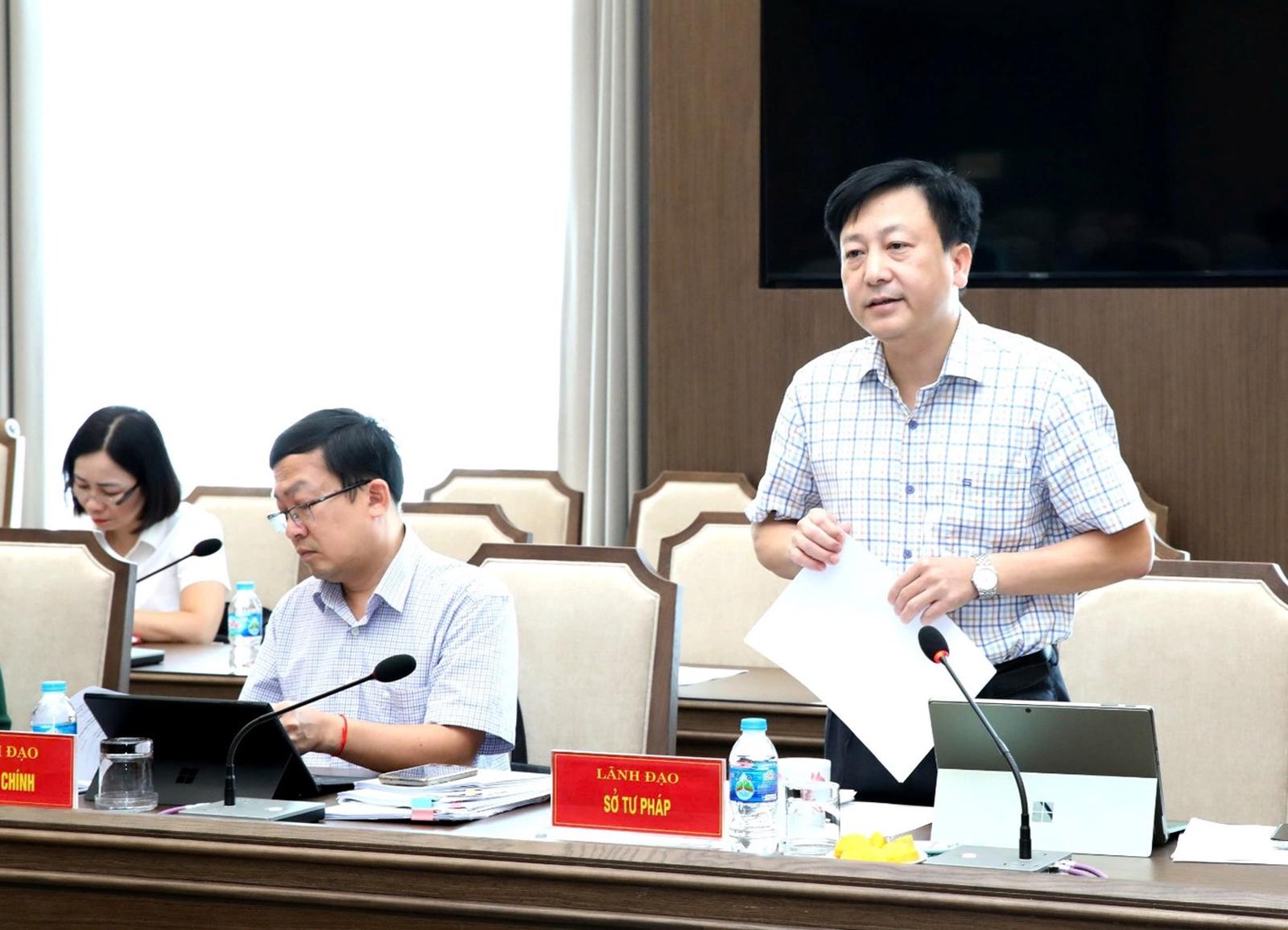 Ông Đặng Định Chung, Giám đốc Sở Tư pháp phát biểu tại Phiên họp thứ nhất, Ban Chỉ đạo hoàn thiện thể chế, pháp luật tỉnh Lào Cai đánh giá kết quả hoạt động sau 3 tháng thành lập. Ảnh: Hoàng Hiệp